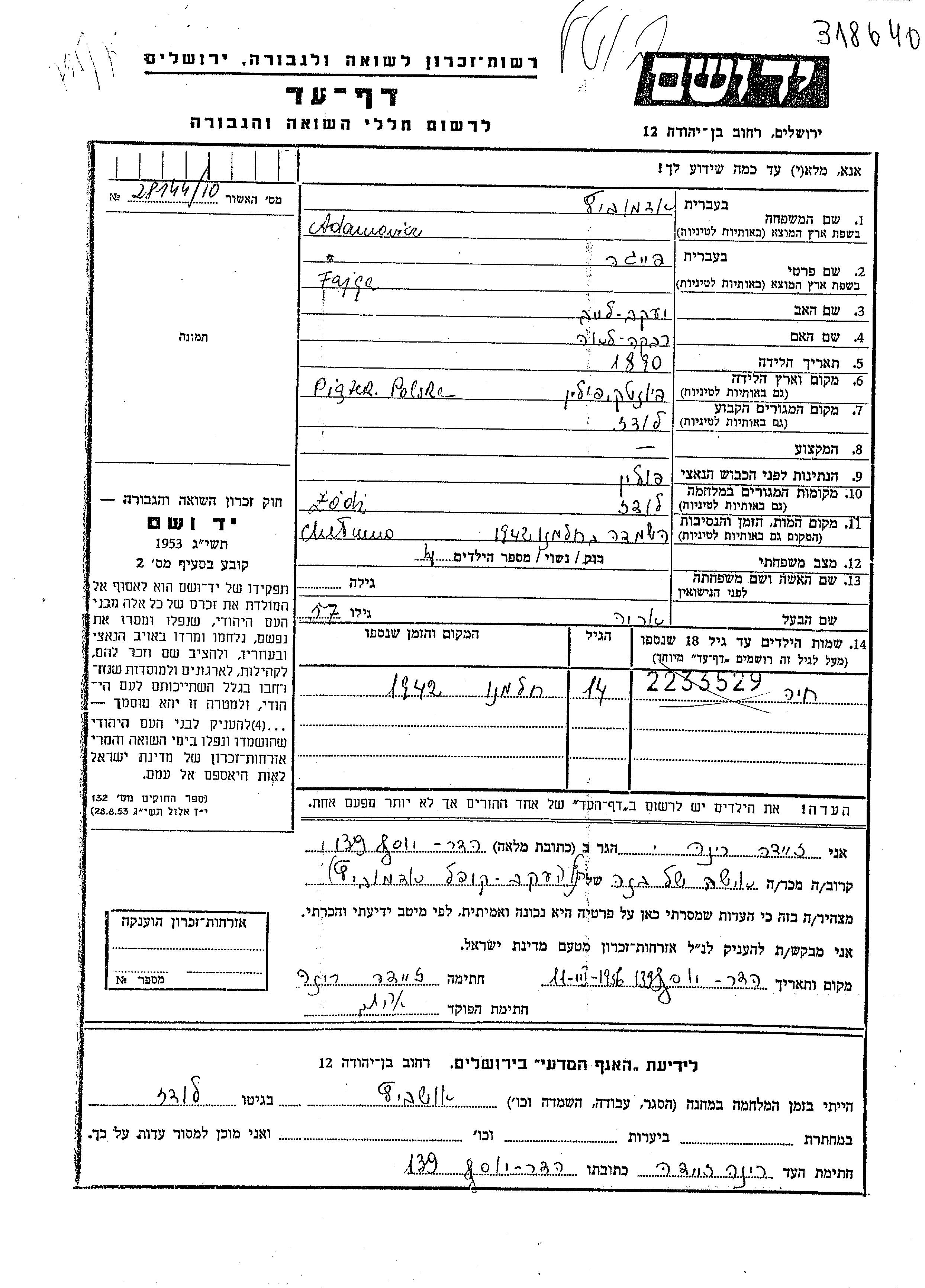 Yad Vashem - Pages of Testimony Names Memorial Collection