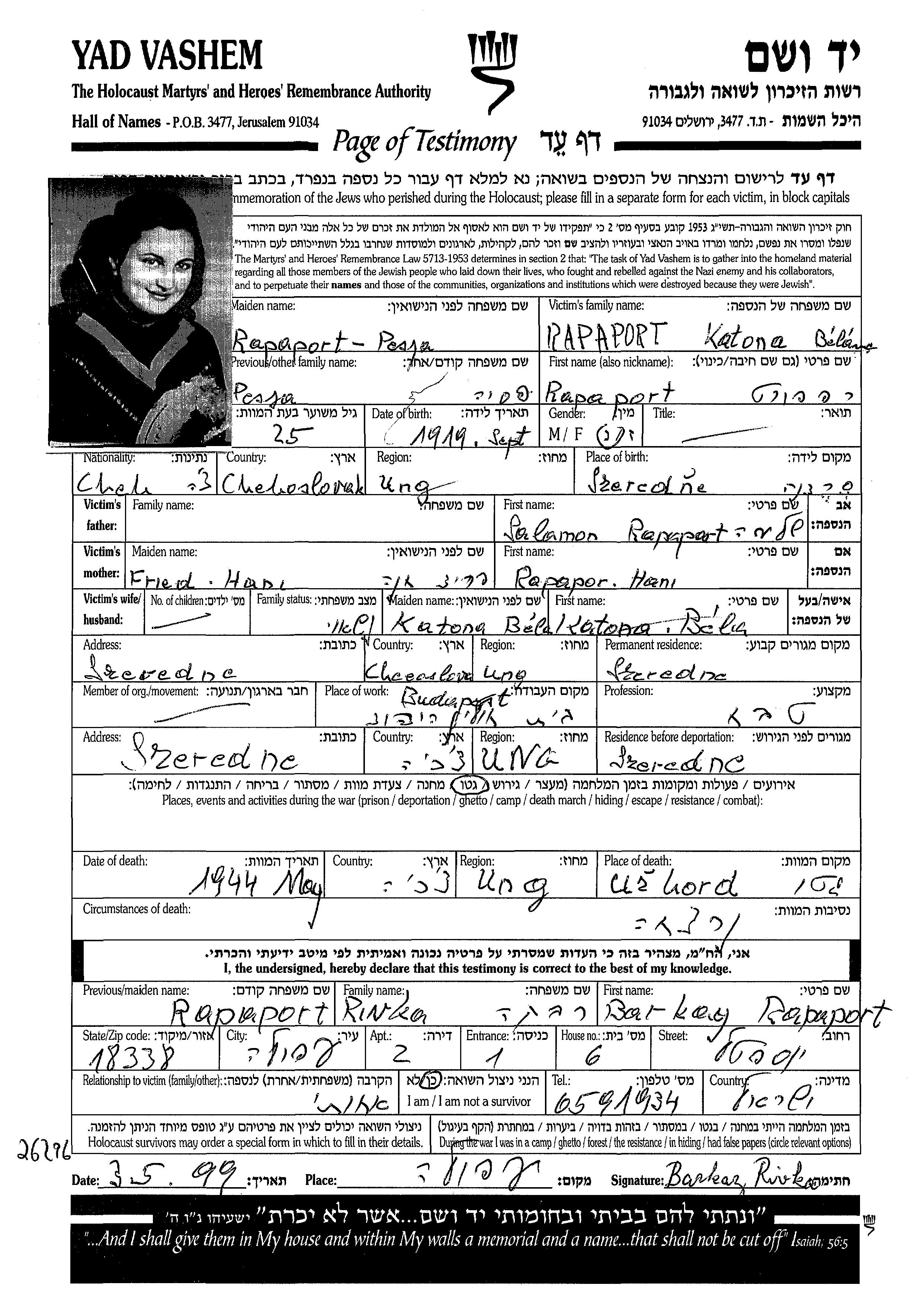 Rapaport | Piroshka Petu Pesel | 1919 | endroit inconnu, | Feuille de témoignage |