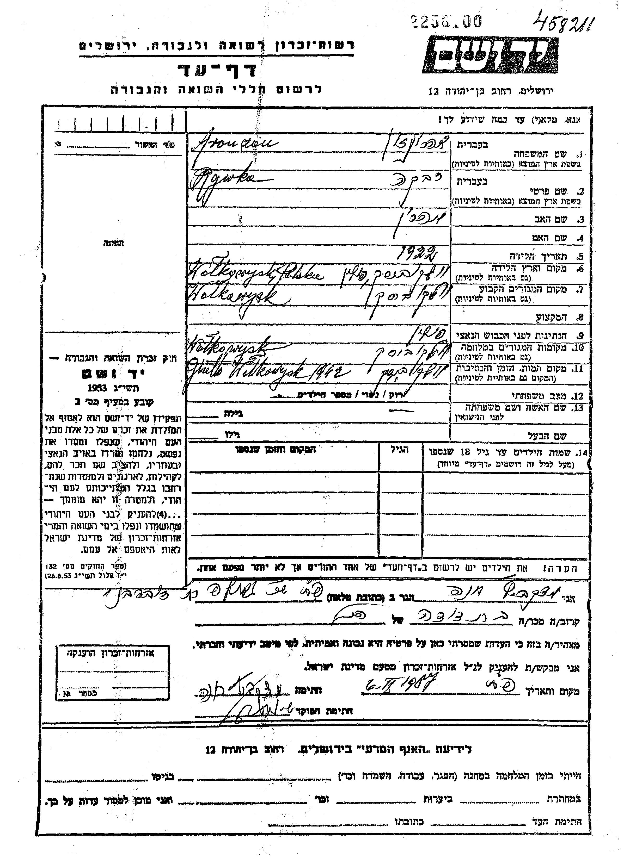 Aronzon Rywka 1922 Wolkowysk, Pologne Feuille de témoignage