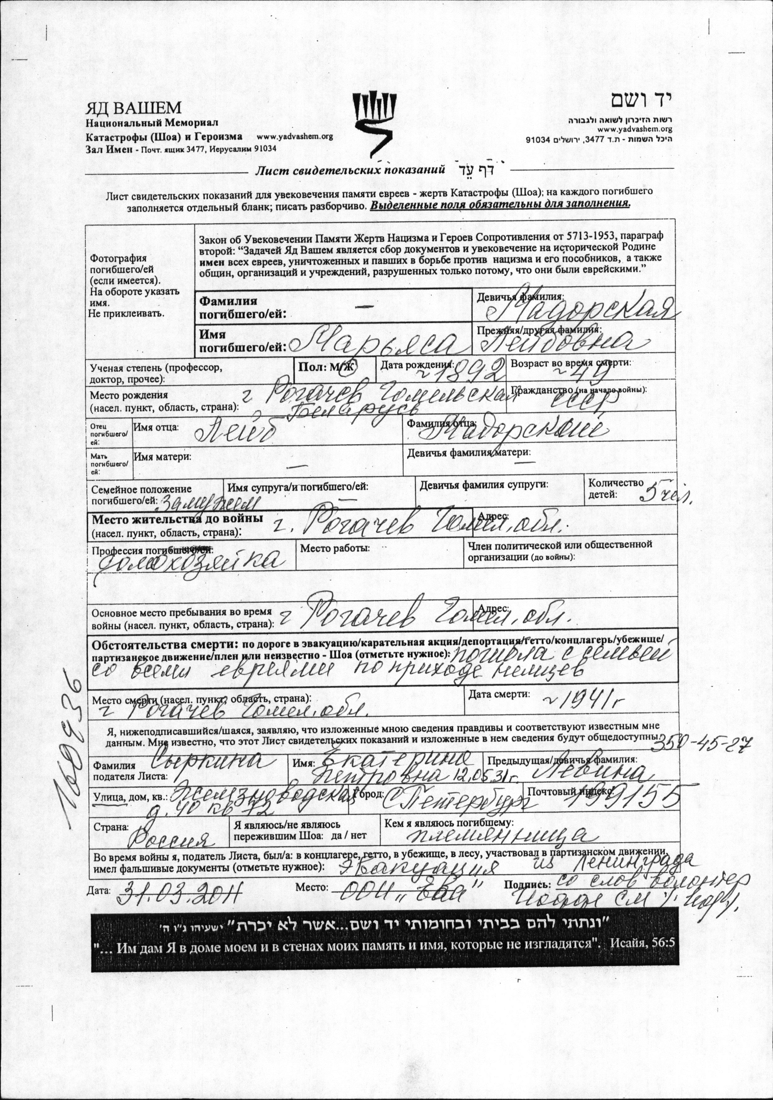 Maryasa a été assassinée pendant la Shoah. Lieu de la mort: Rogachev, Bélorussie (URSS) en 1941.