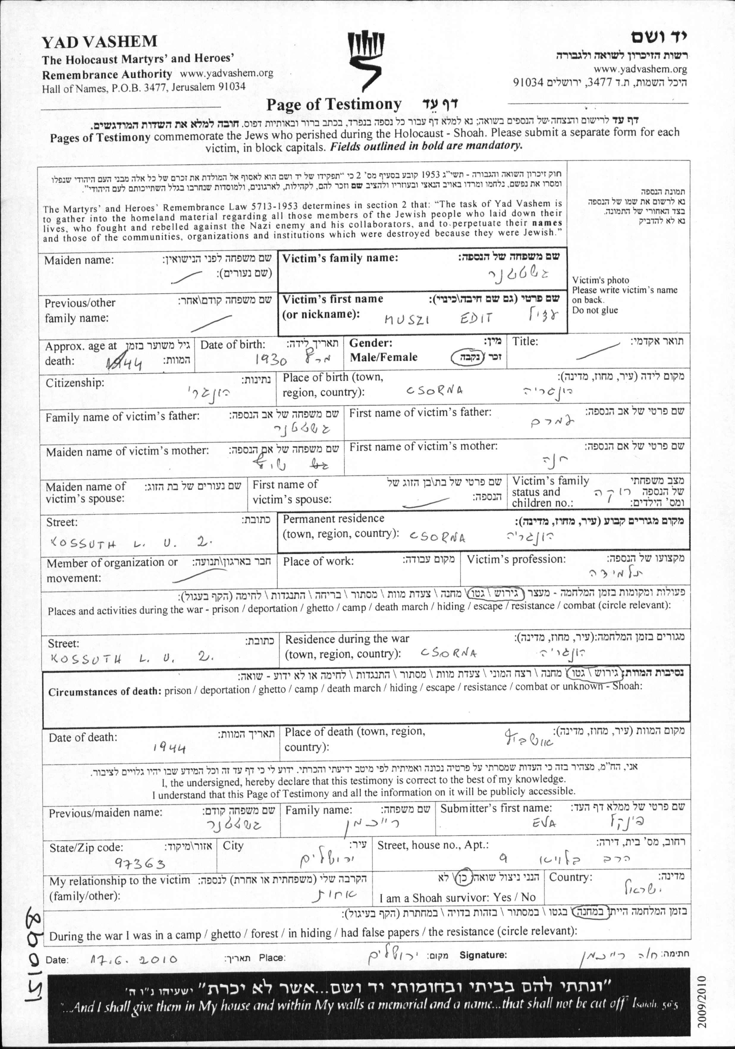 Muszi Edit Adela Geshtetner est née à Csorna, Hongrie en 1930, fille de Amram et de Chana née Shif. Elle était Élève et Adolescent. Avant la seconde guerre mondiale elle vivait à Csorna, Hongrie. Pendant la guerre, elle était à Csorna, Hongrie.