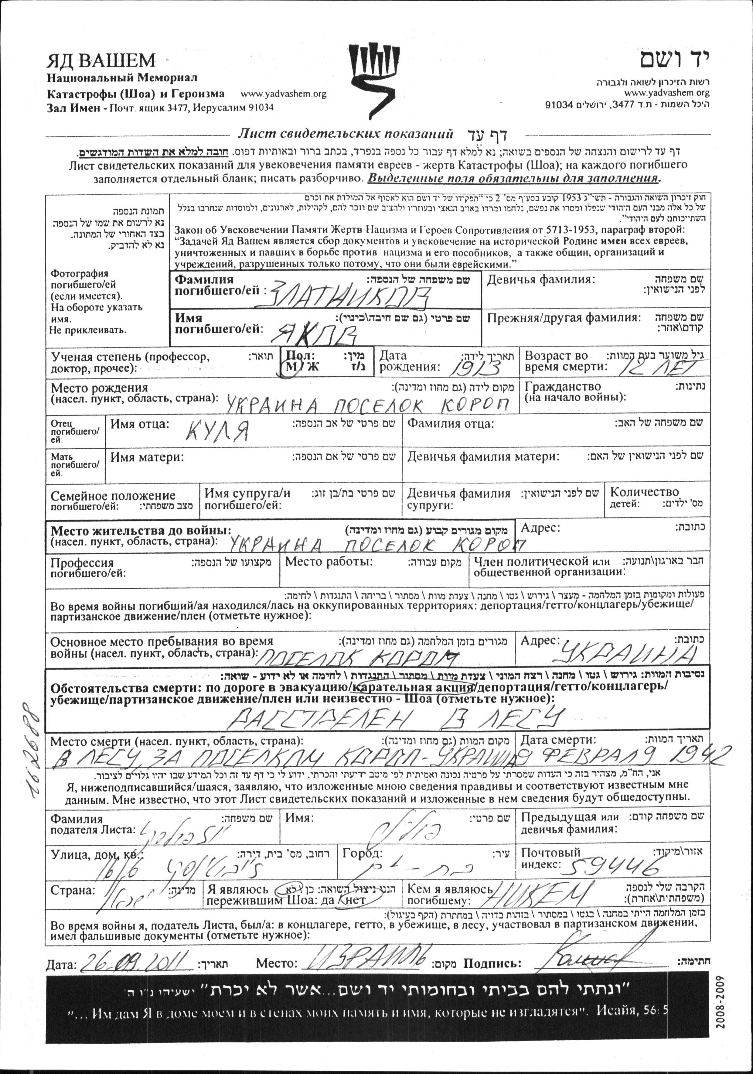 Zlatnikov Yakov 1913 Korop, Ukraine (URSS) Feuille de témoignage