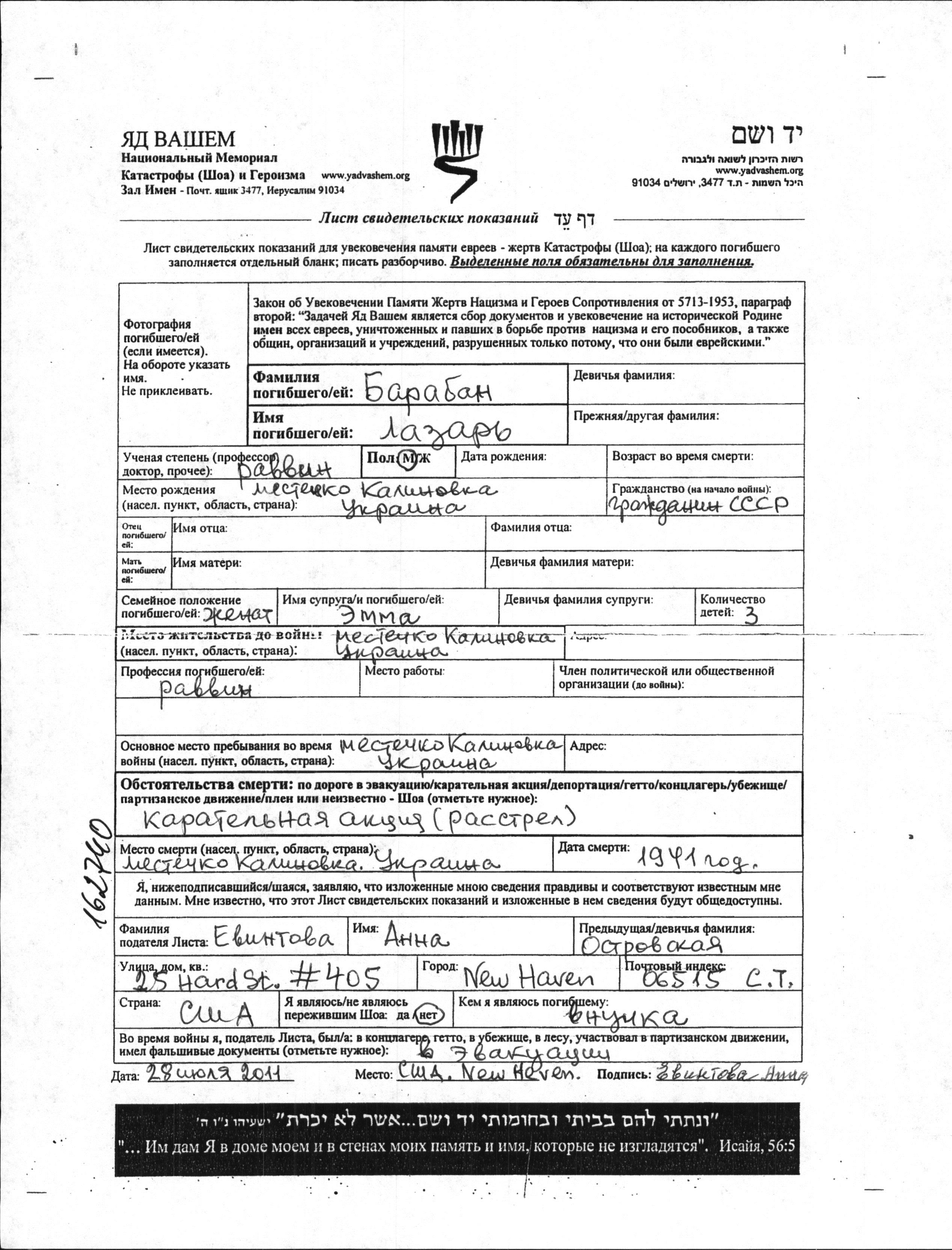 Lazar Baraban est né à Kalinovka, Ukraine (URSS). Il était Rabbin et Mariée à Emma. Avant la seconde guerre mondiale il vivait à Kalinovka, Ukraine (URSS). Au cours de la guerre, il était à Kalinovka, Ukraine (URSS).