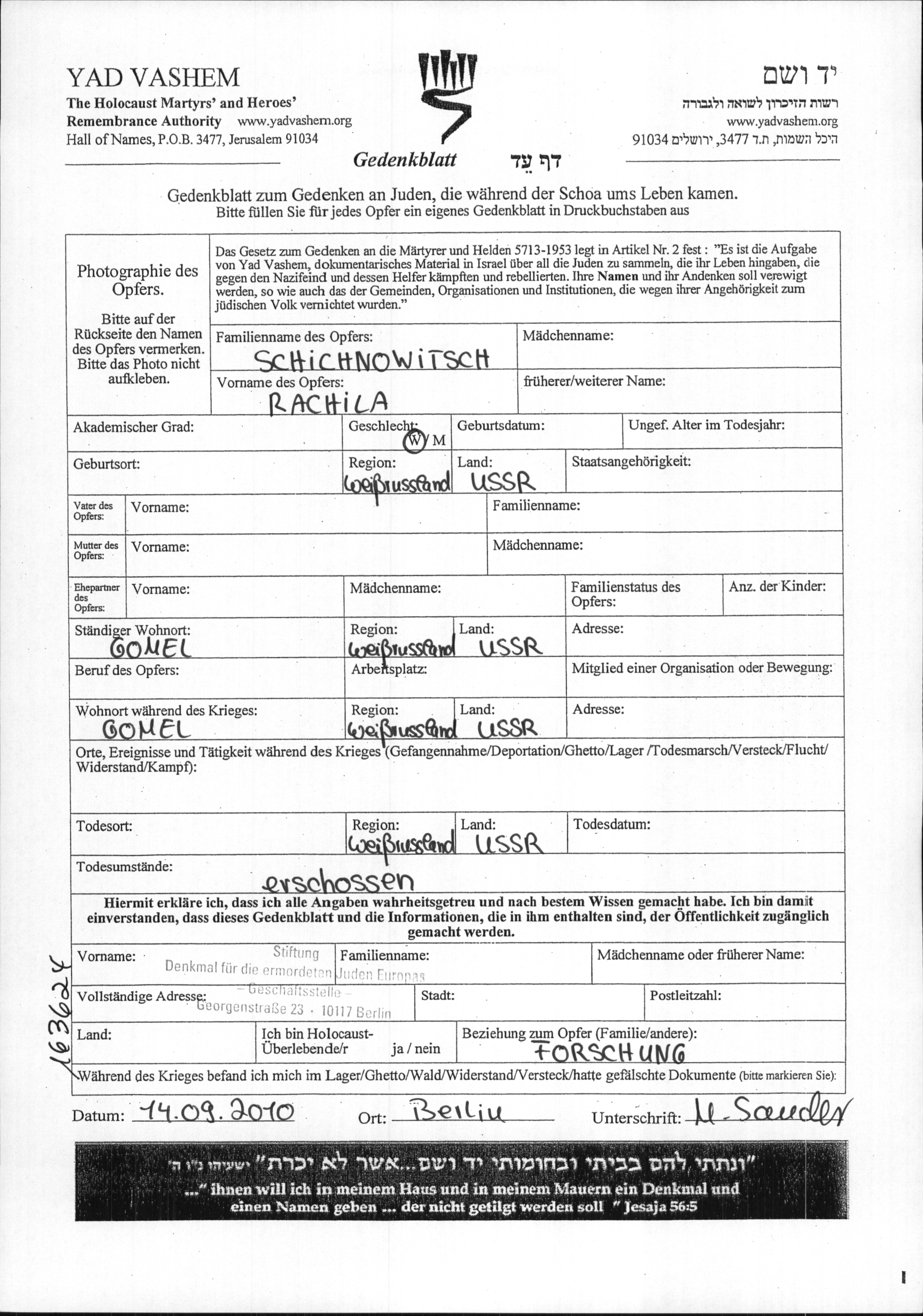Schichnowitsch Rachila Gomel, Bélorussie (URSS) Feuille de témoignage