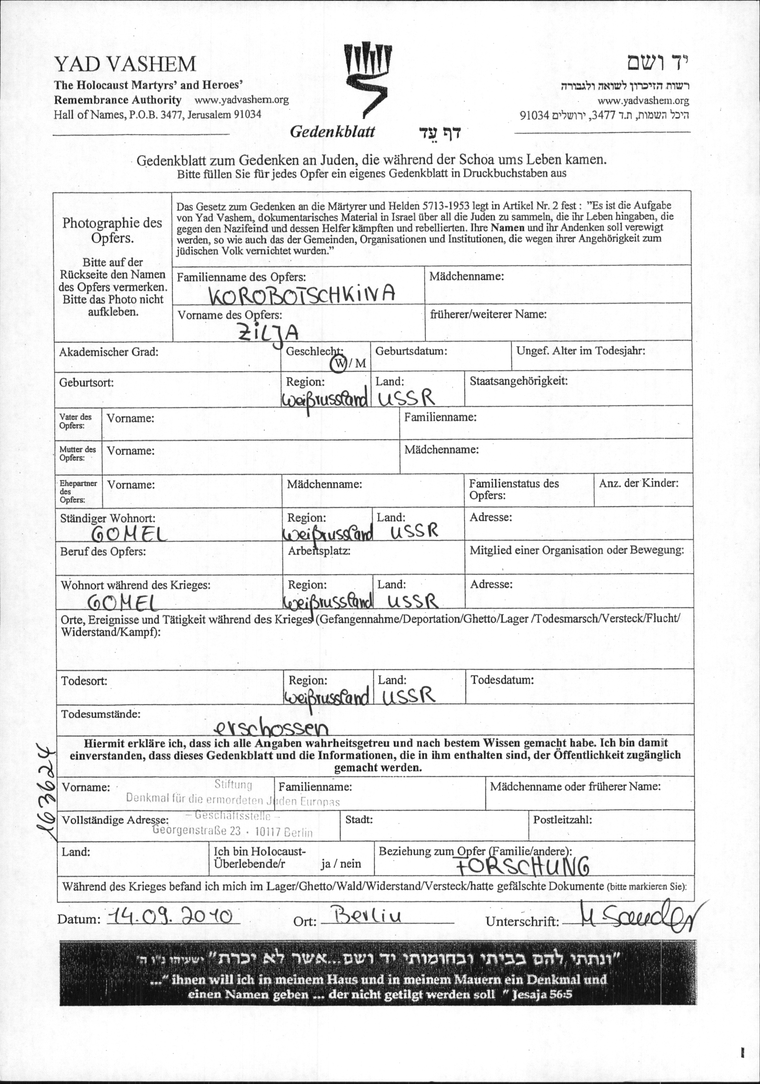 Zilja a été assassinée pendant la Shoah. Lieu de la mort: Bélorussie (URSS).