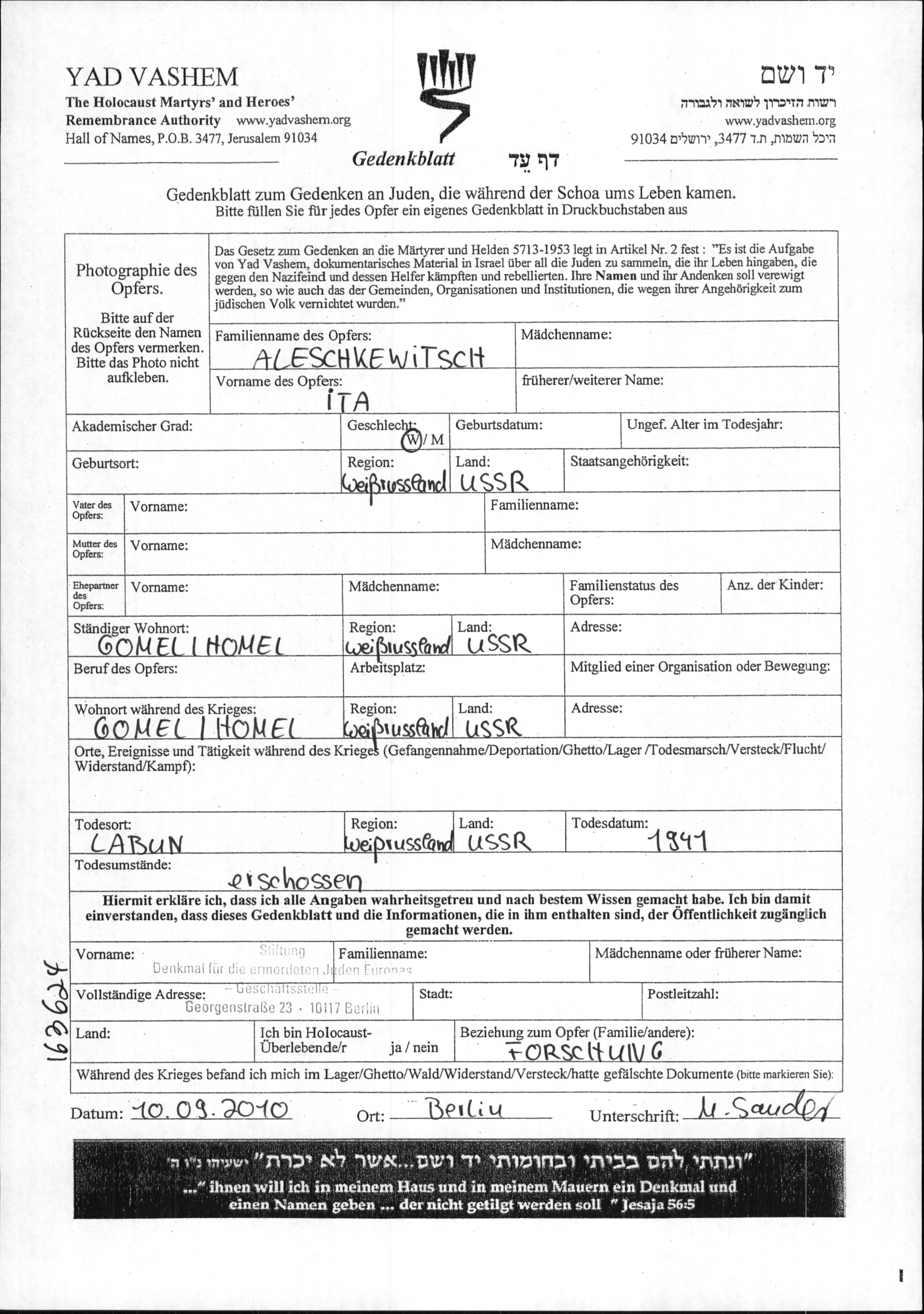 Ita Aleschkewitsch est née à Bélorussie (URSS). Avant la seconde guerre mondiale elle vivait à Gomel, Bélorussie (URSS). Pendant la guerre, elle était à Gomel, Bélorussie (URSS).