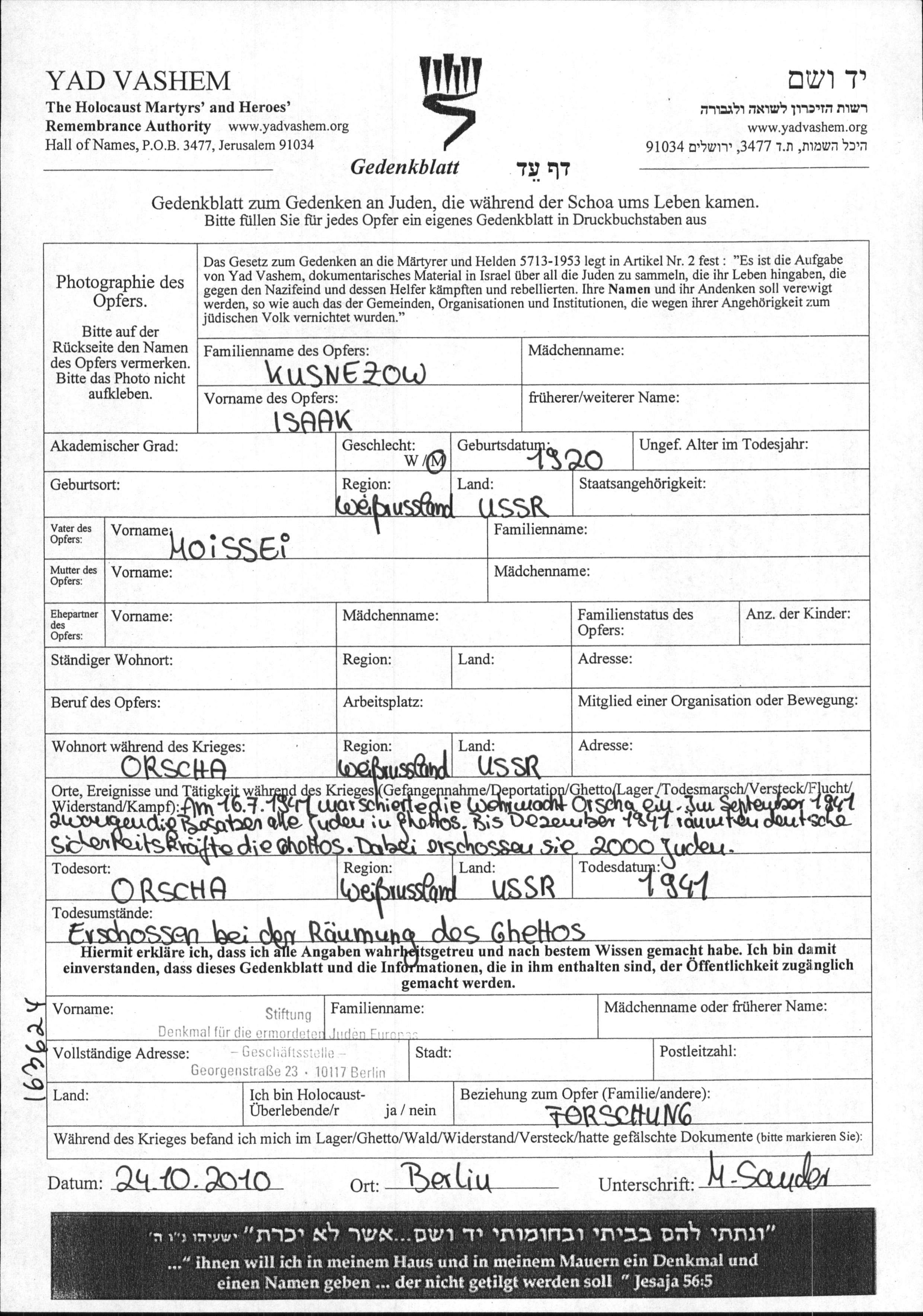 Isaak a été assassiné pendant la Shoah. Lieu de la mort: Orsha, Bélorussie (URSS) en 1941.