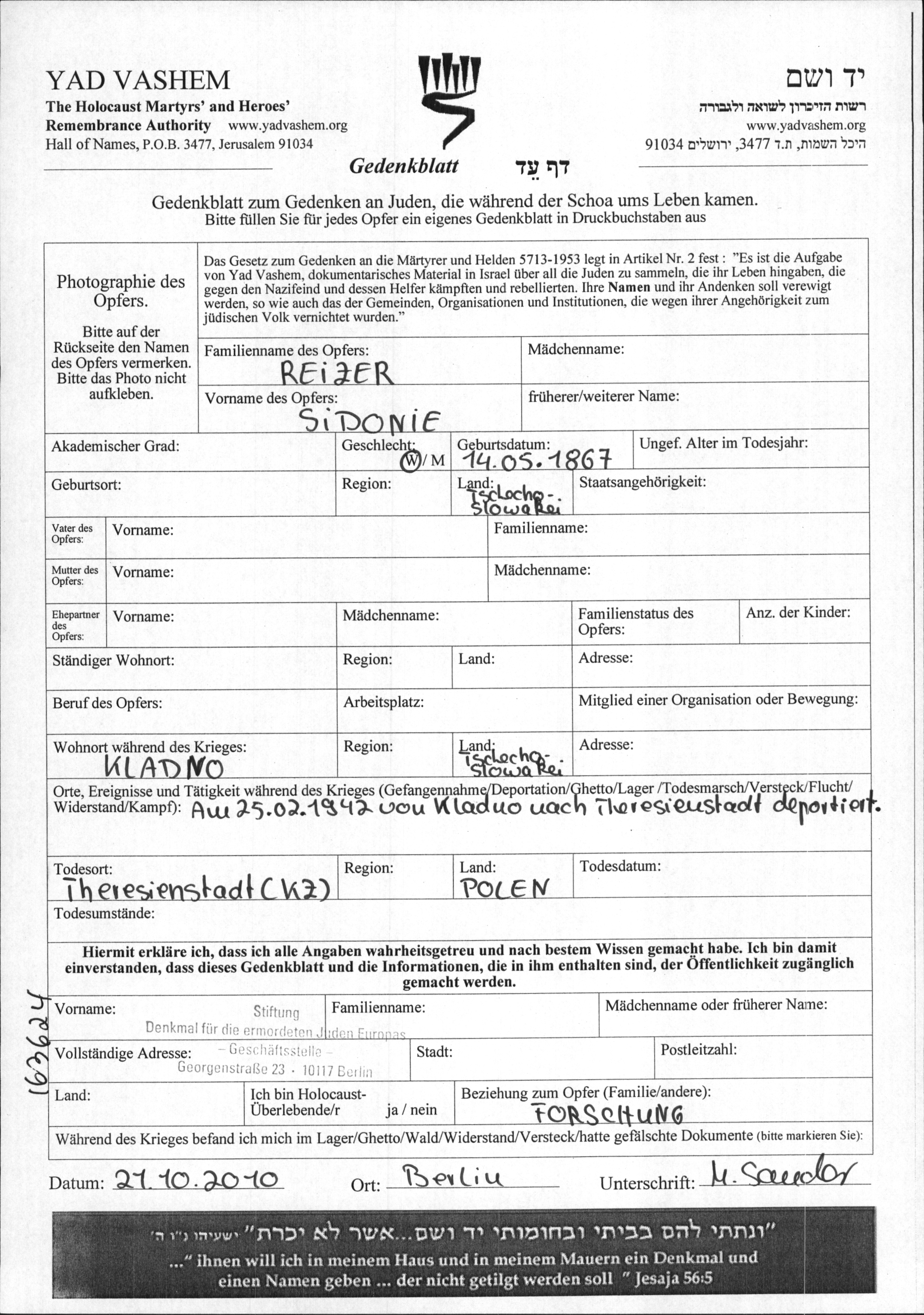 Sidonia a été assassinée pendant la Shoah. Lieu de la mort: Theresienstadt, Tchécoslovaquie.