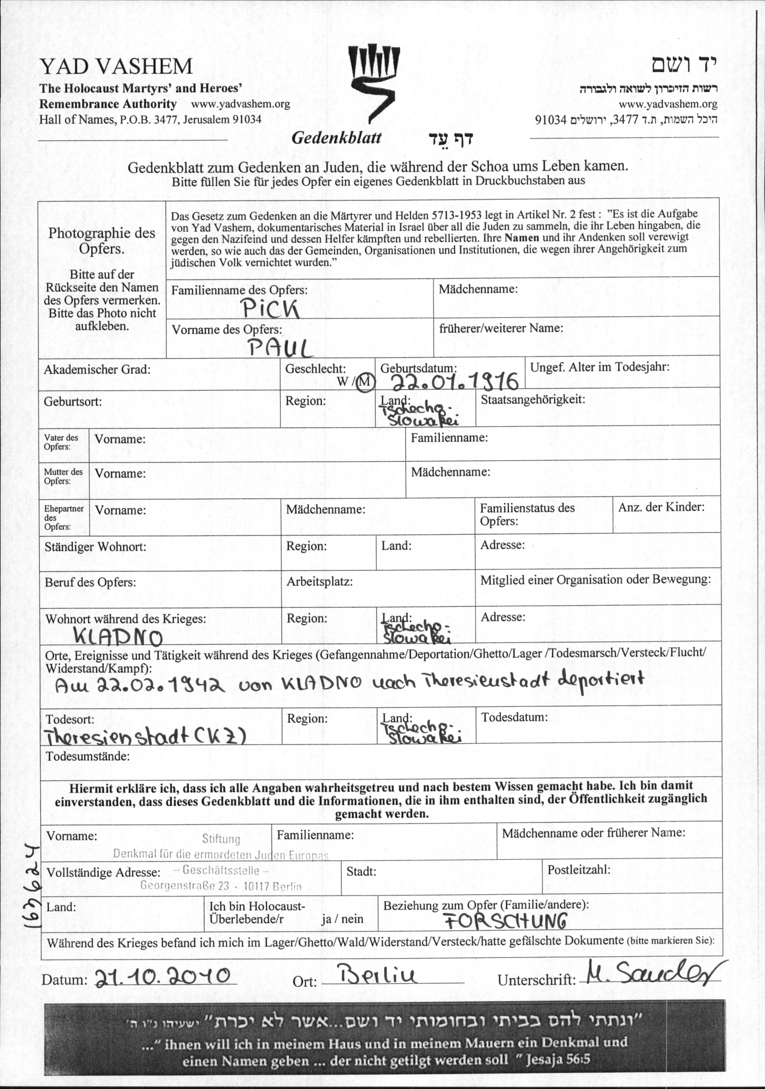 Paul a été assassiné pendant la Shoah. Lieu de la mort: Theresienstadt, Tchécoslovaquie.
