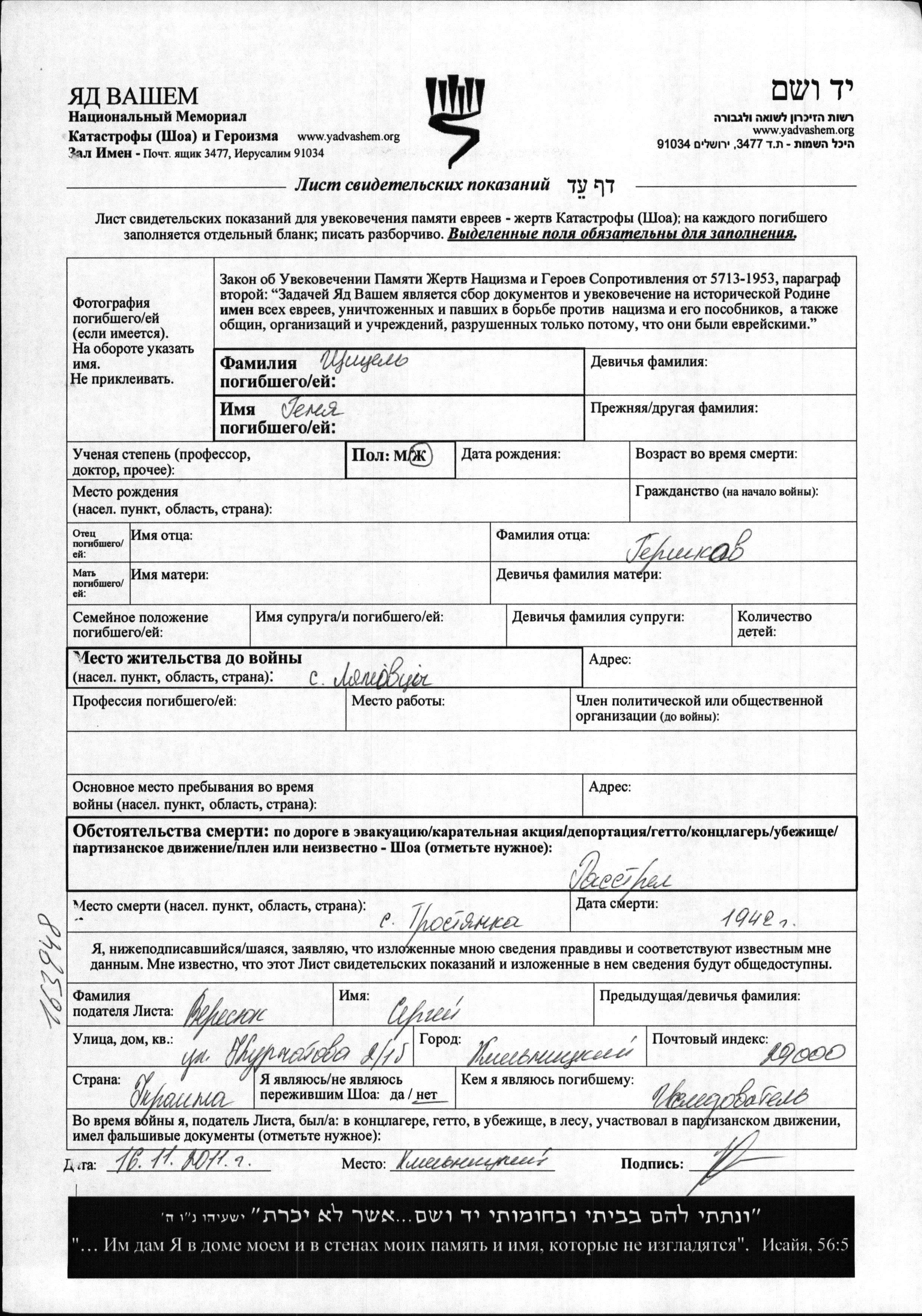 Shchitzel Genya Lyakhovtsy, Ukraine (URSS) Feuille de témoignage