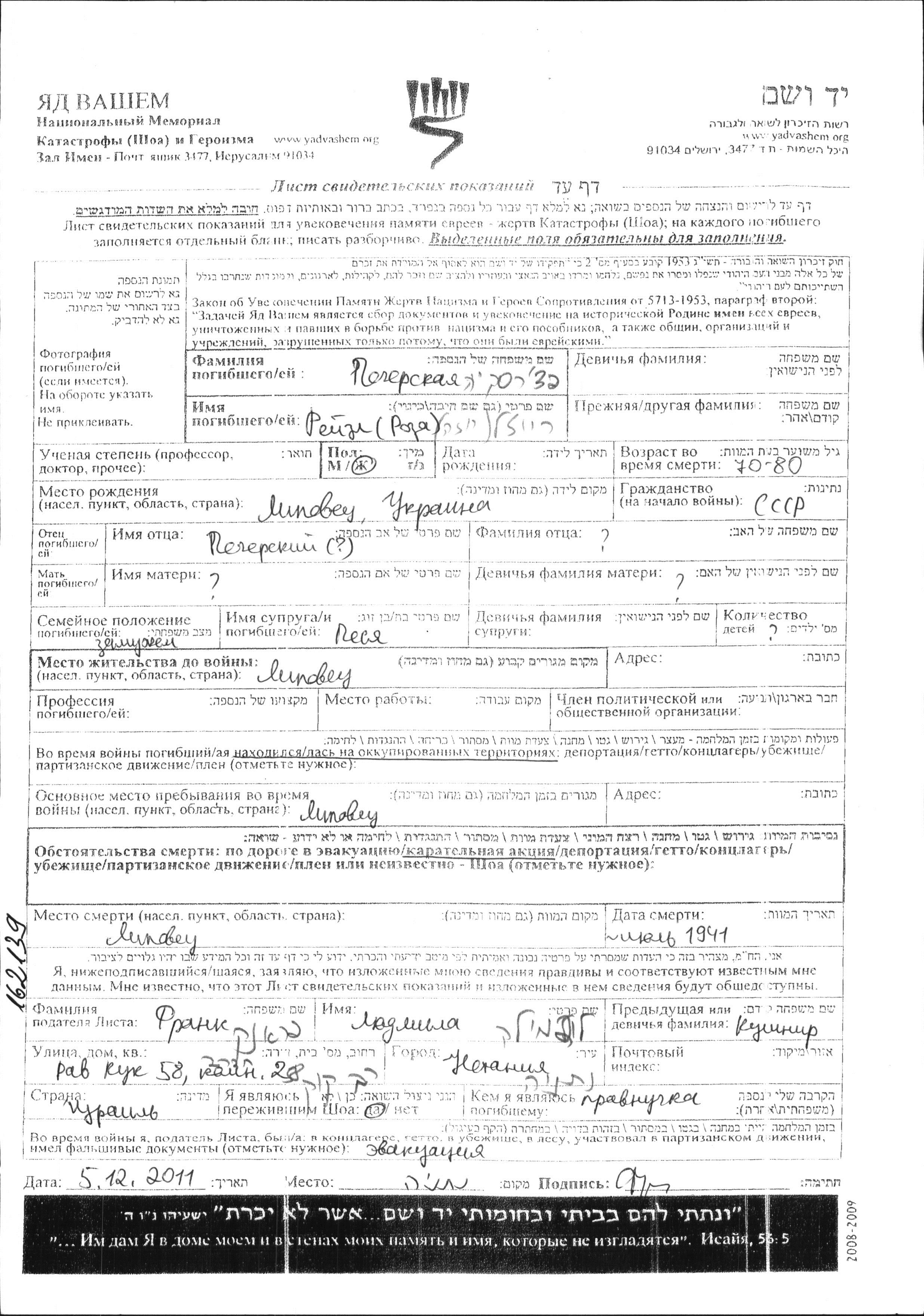 Pecherskaya Reyzl Lipovets, Ukraine (URSS) Feuille de témoignage