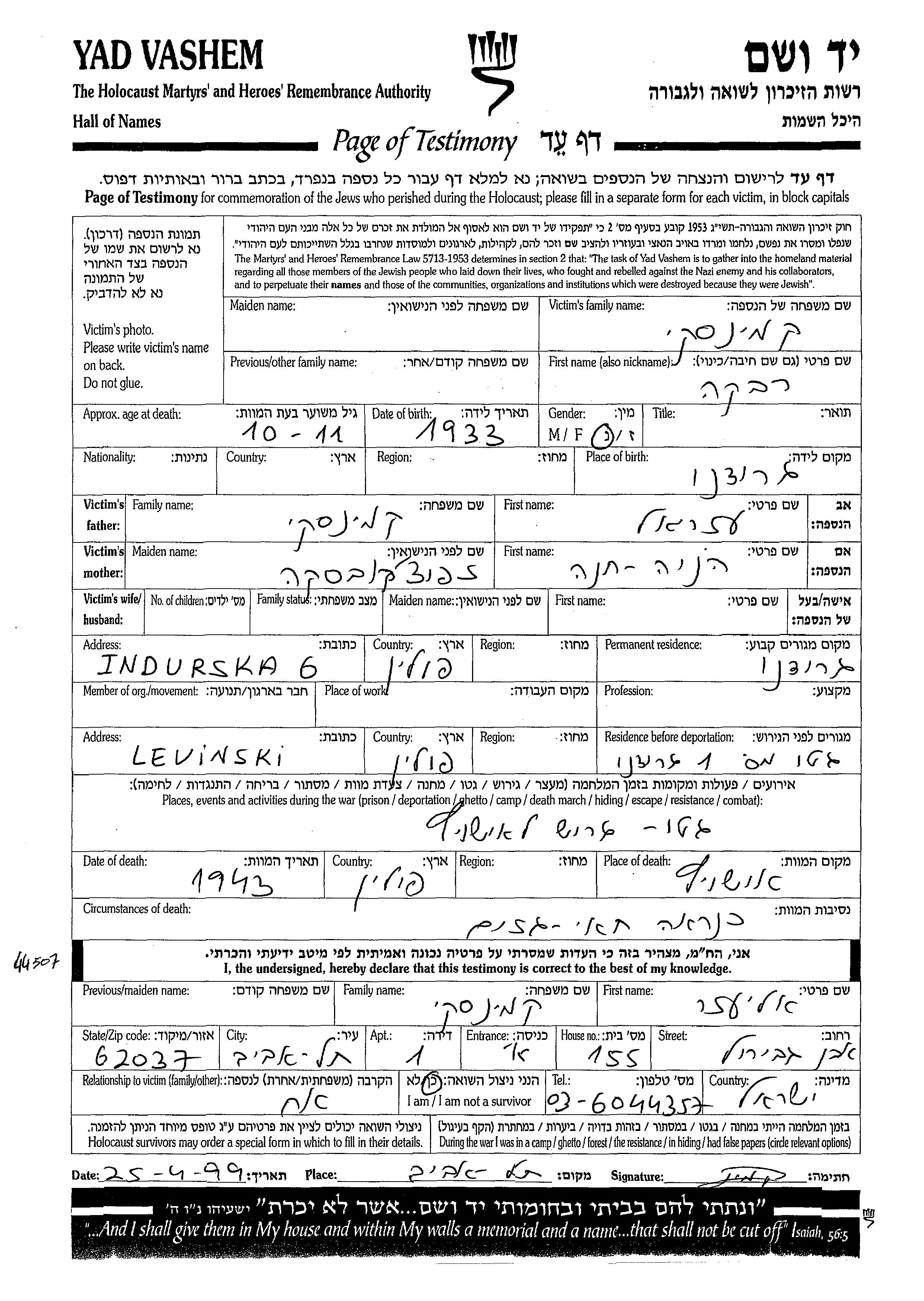 Kaminski Rivka 1933 Grodno, Pologne Feuille de témoignage