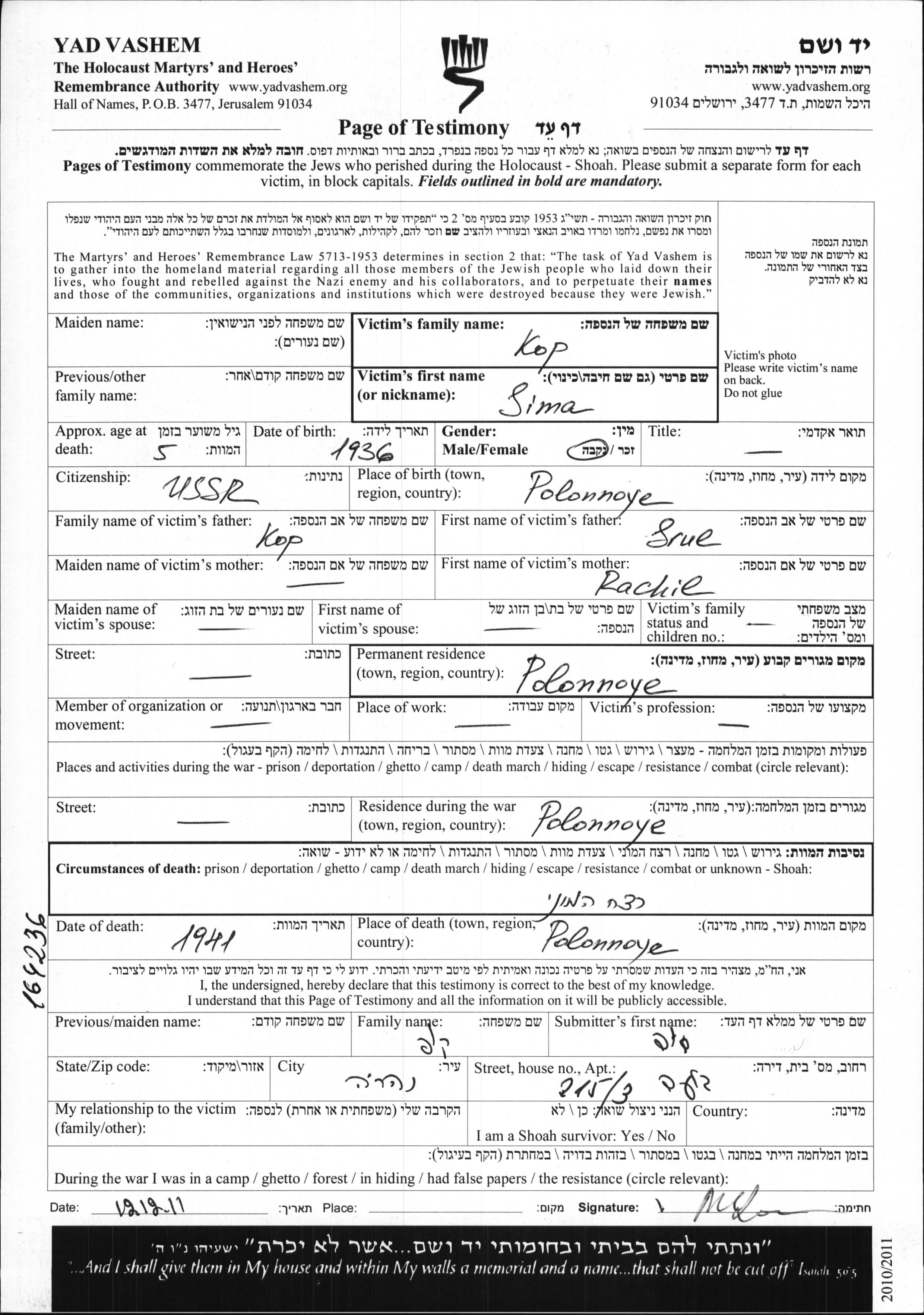 Sima Kop est née à Polonnoye, Ukraine (URSS) en 1936, fille de Srul et de Rachil. Elle était Enfant. Avant la seconde guerre mondiale elle vivait à Polonnoye, Ukraine (URSS). Pendant la guerre, elle était à Polonnoye, Ukraine (URSS).