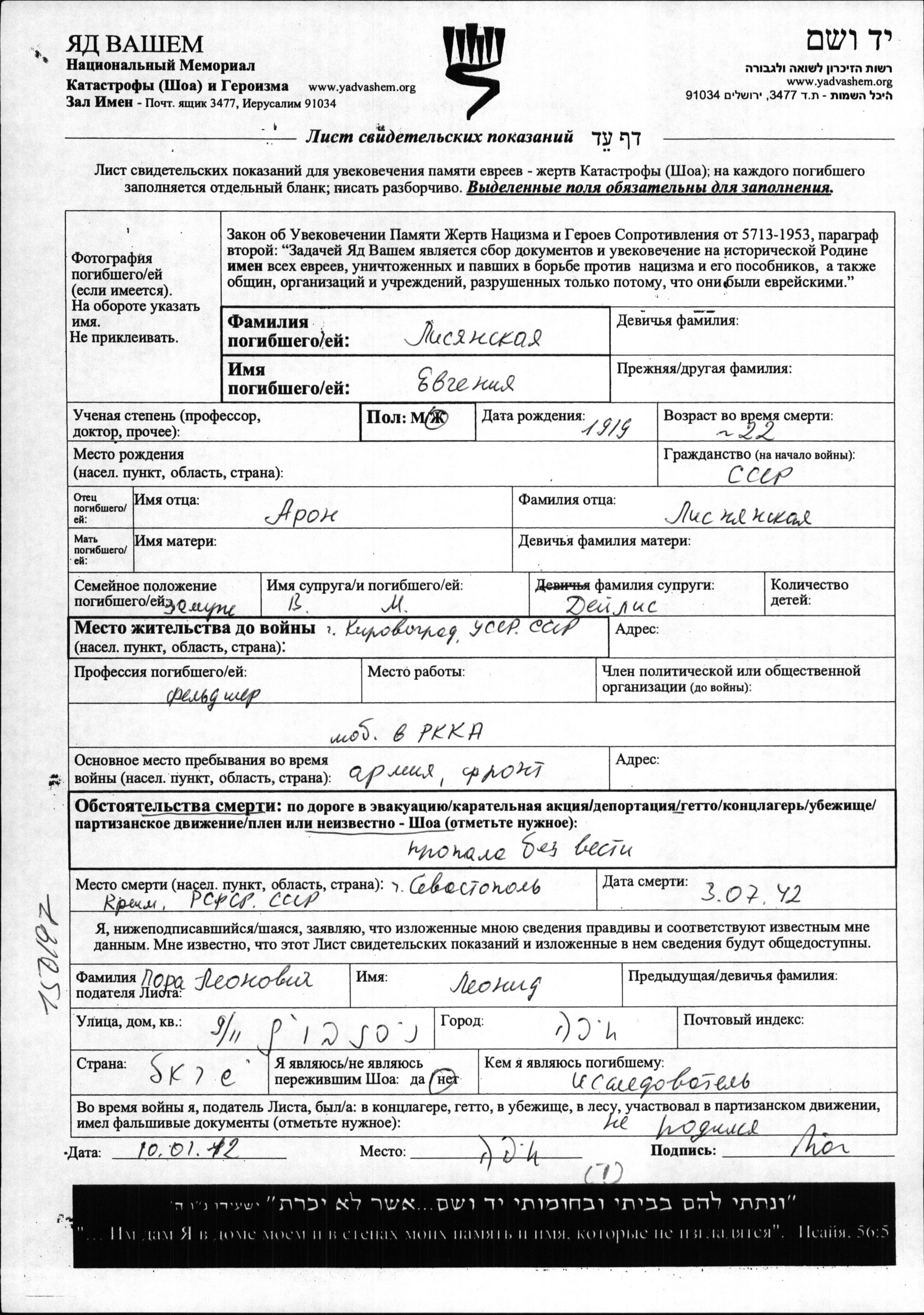 Lisyanskaya Lisnyanskaya Deylis Yevgeniya 1919 Kirovograd, Ukraine (URSS) Feuille de témoignage