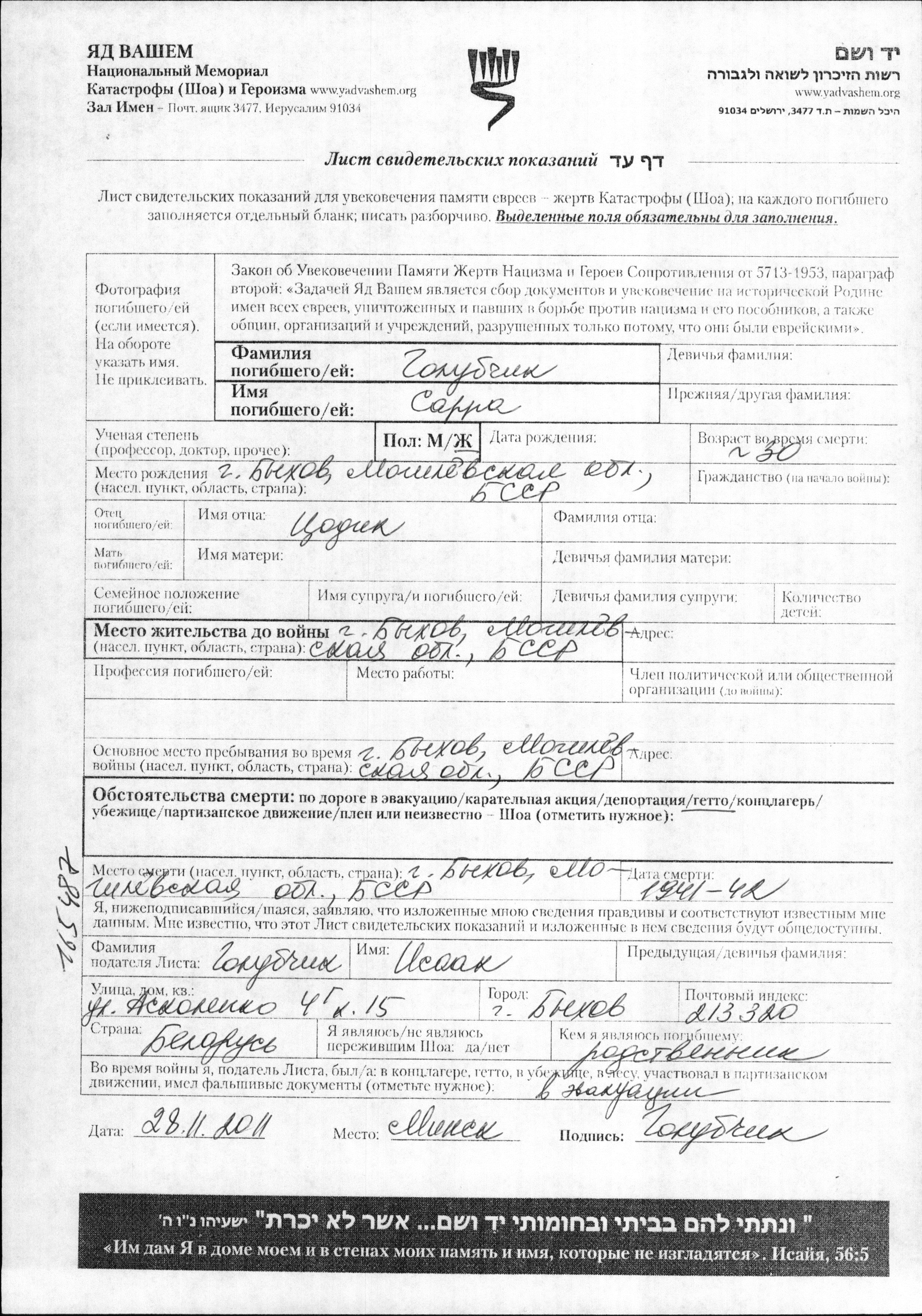 Golubchik Sarra Bykhov, Bélorussie (URSS) Feuille de témoignage