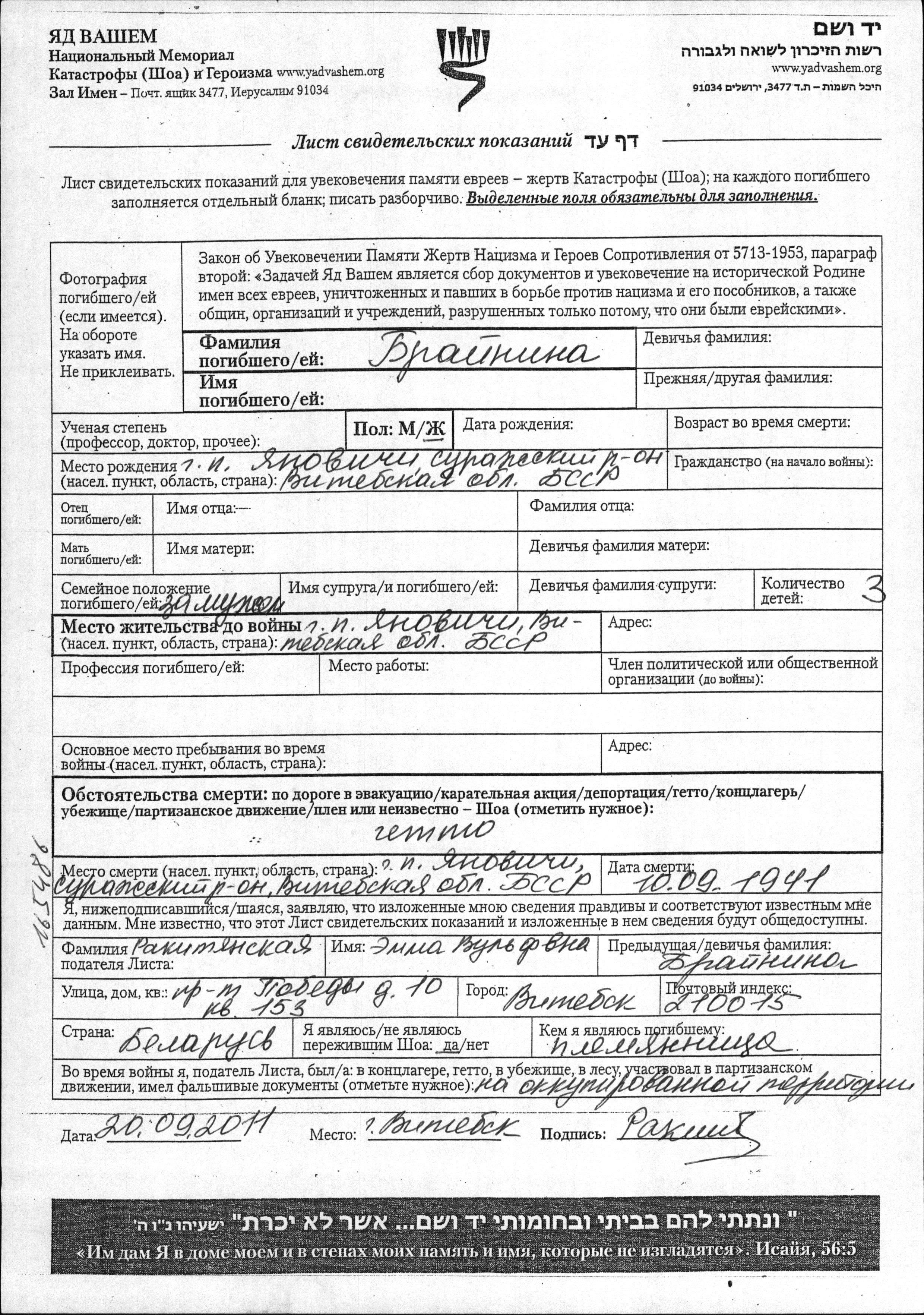 Braynina prénom inconnu Yanovichi, Bélorussie (URSS) Feuille de témoignage