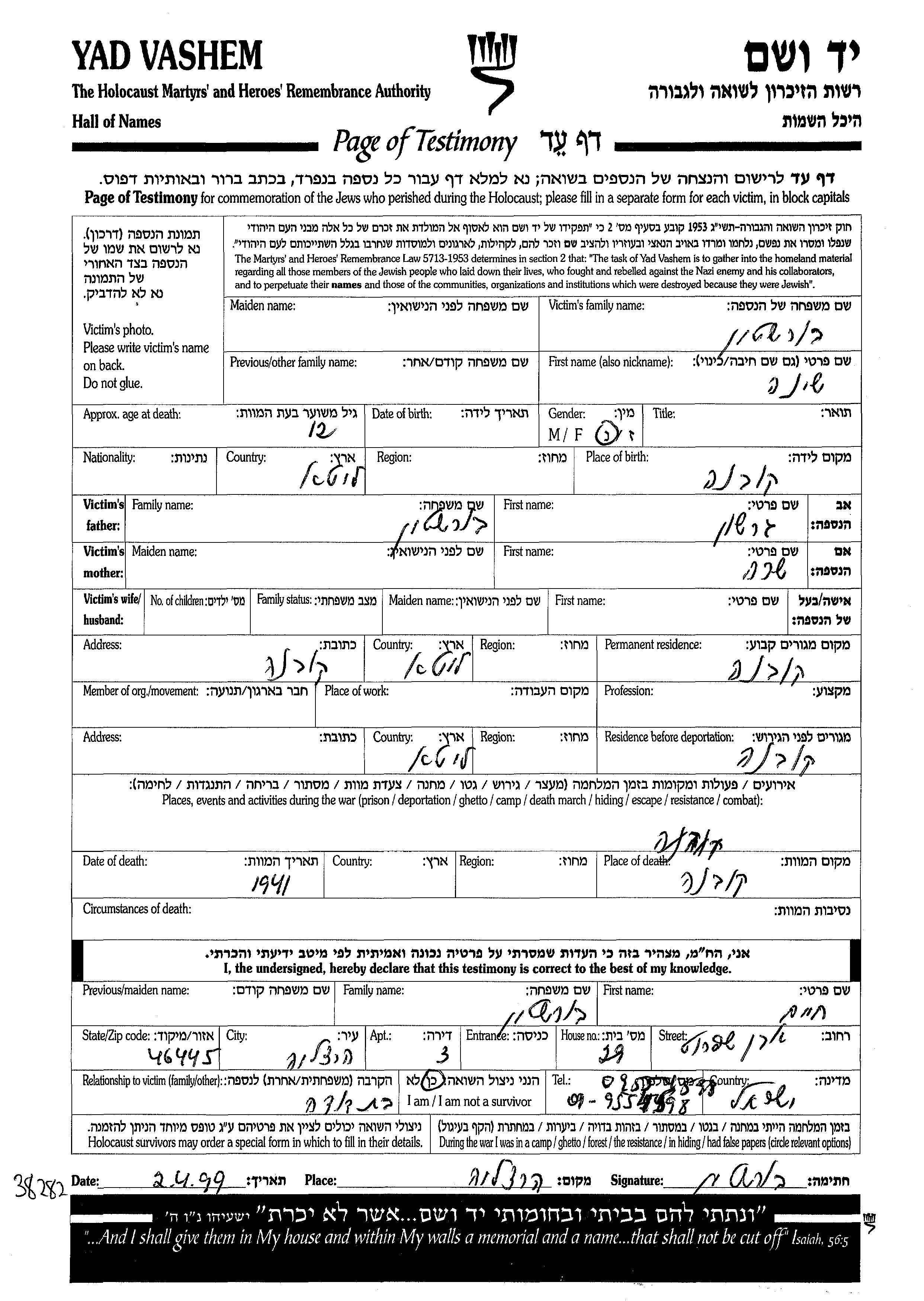 Yad Vashem - Pages of Testimony Names Memorial Collection