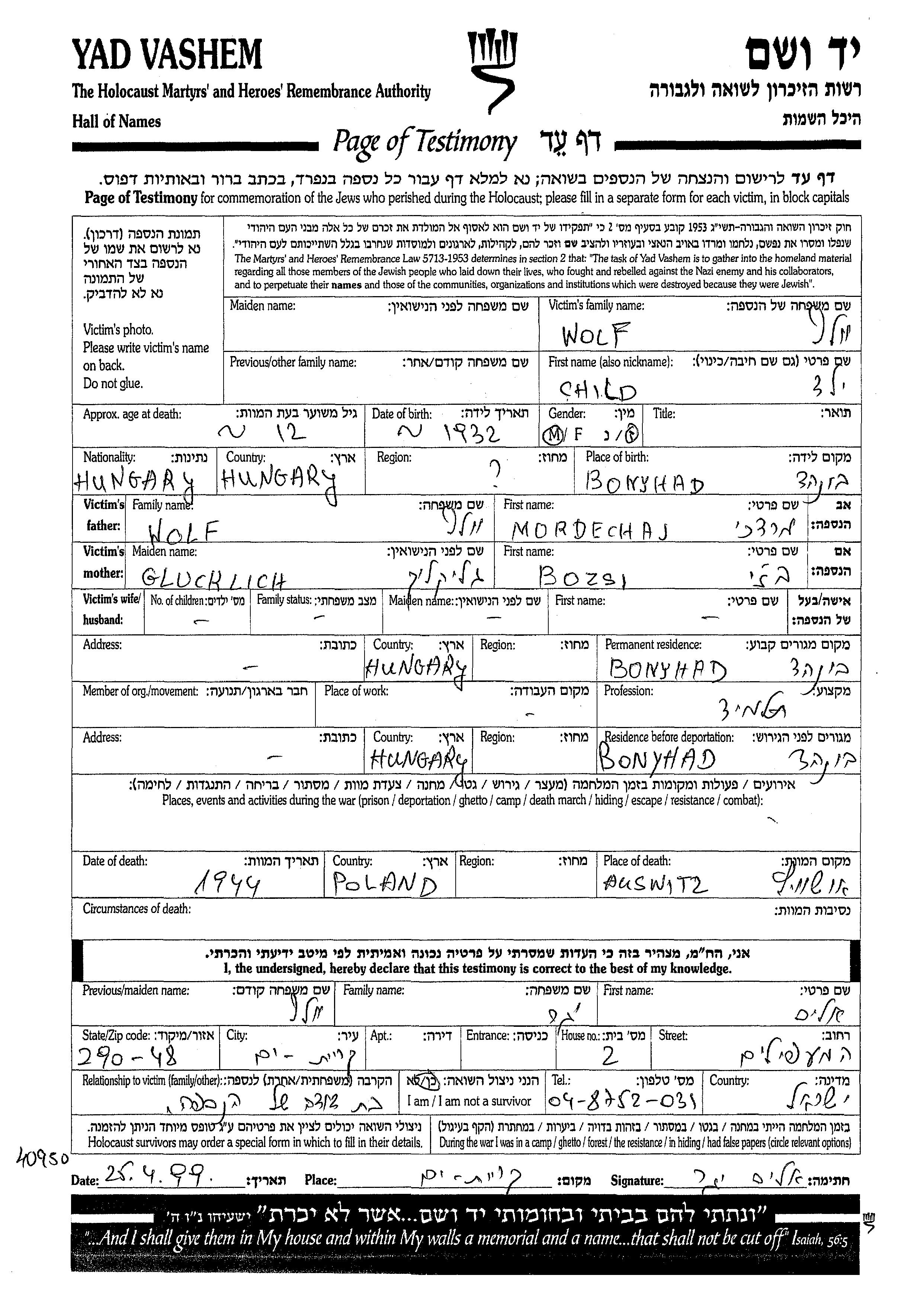 Wolf prénom inconnu 1932 Bonyhad, Hongrie Feuille de témoignage