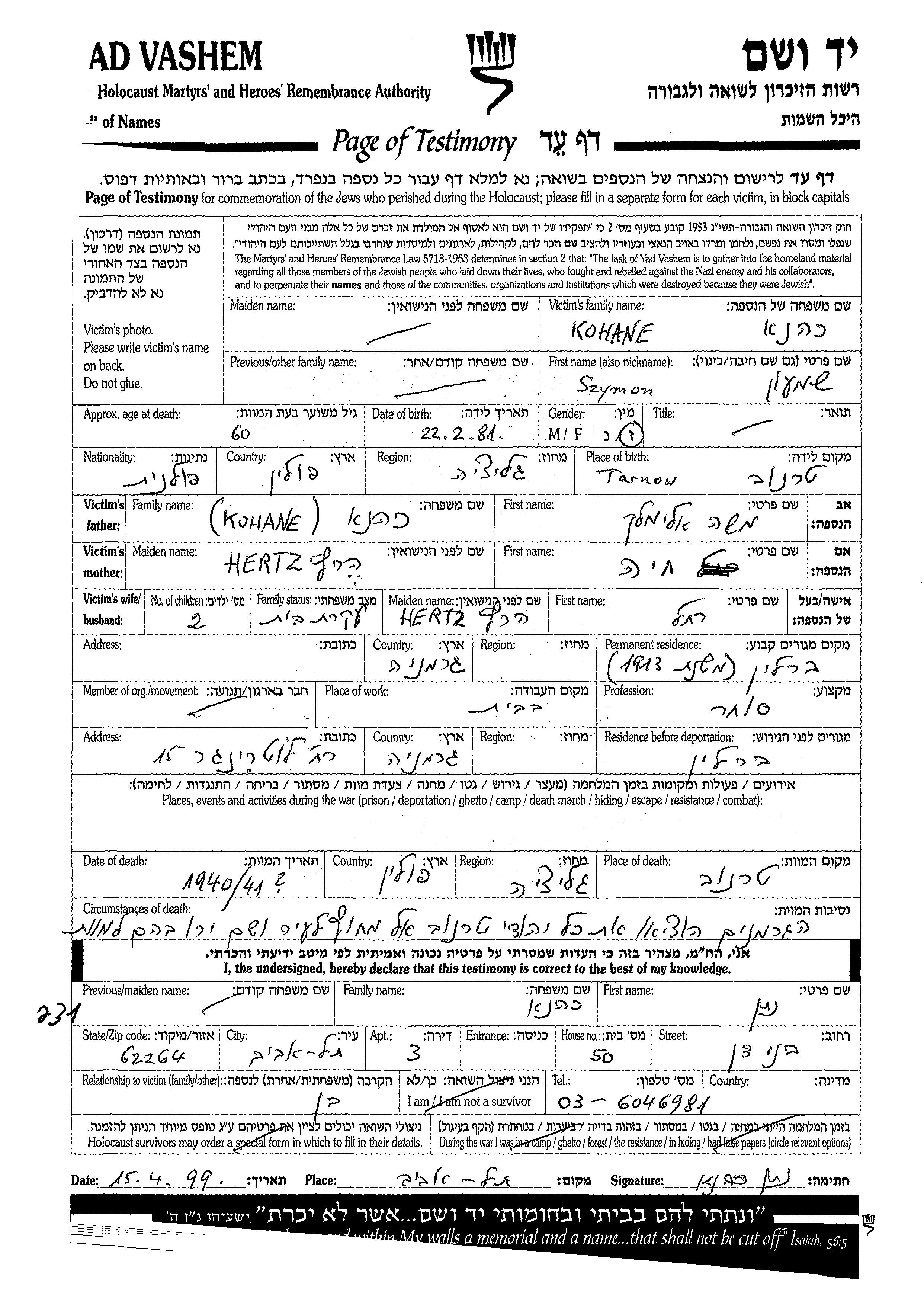 Szymon a été assassiné pendant la Shoah. Lieu de la mort: Tarnow, Pologne en 1940.