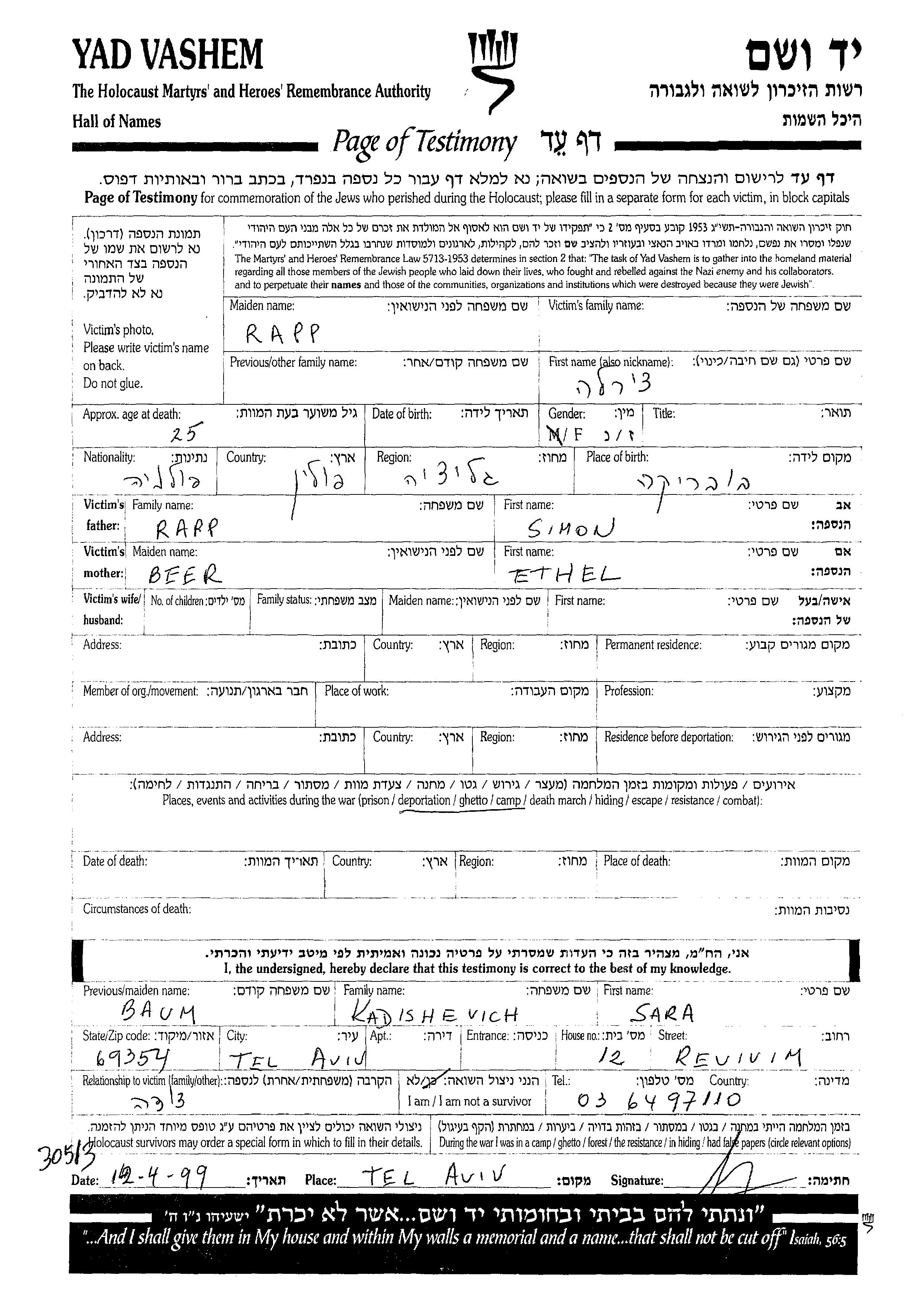 Yad Vashem - Pages of Testimony Names Memorial Collection