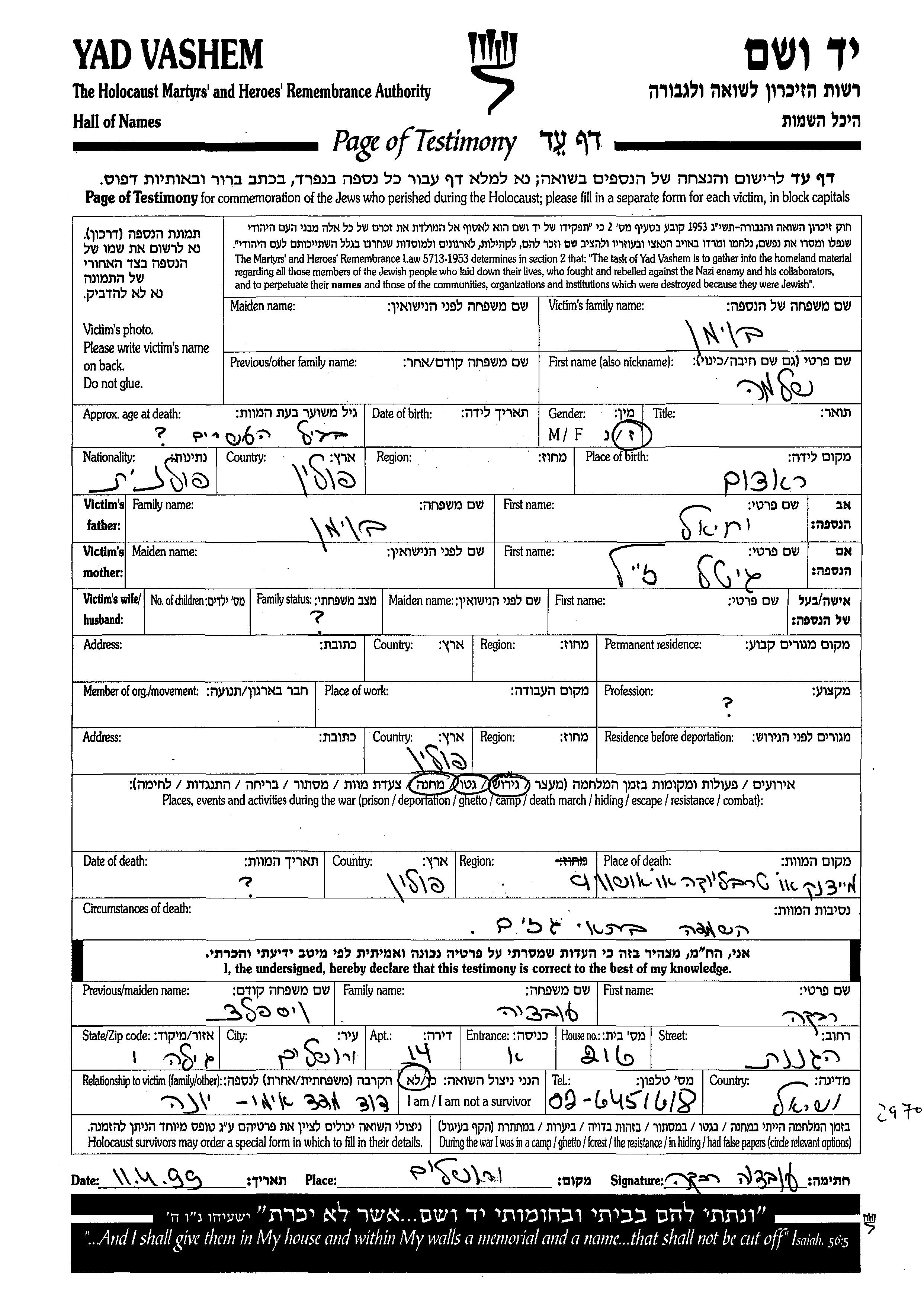 Boiman Shlomo endroit inconnu, Feuille de témoignage