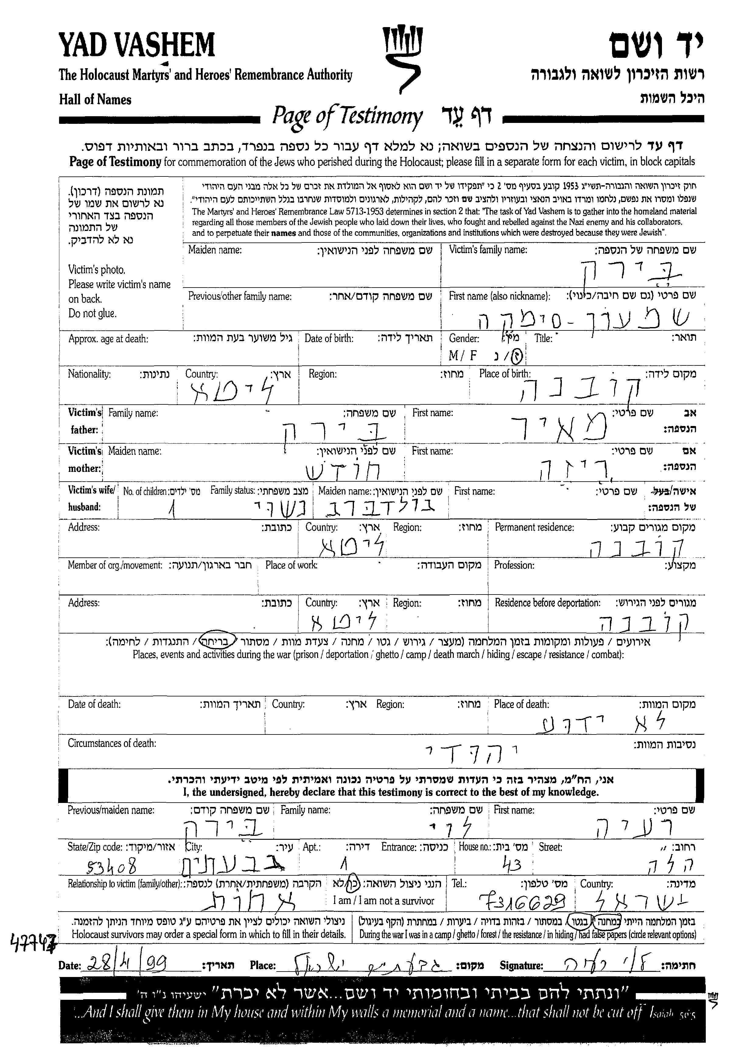 Yad Vashem - Pages of Testimony Names Memorial Collection