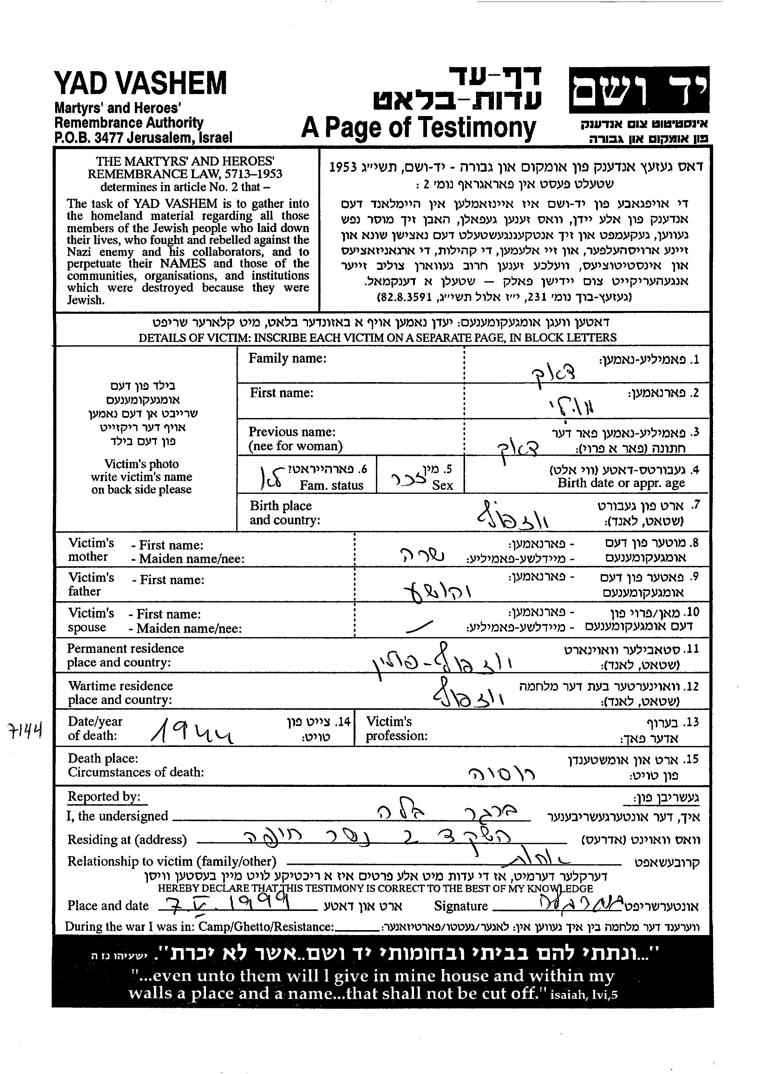 Yad Vashem - Pages of Testimony Names Memorial Collection