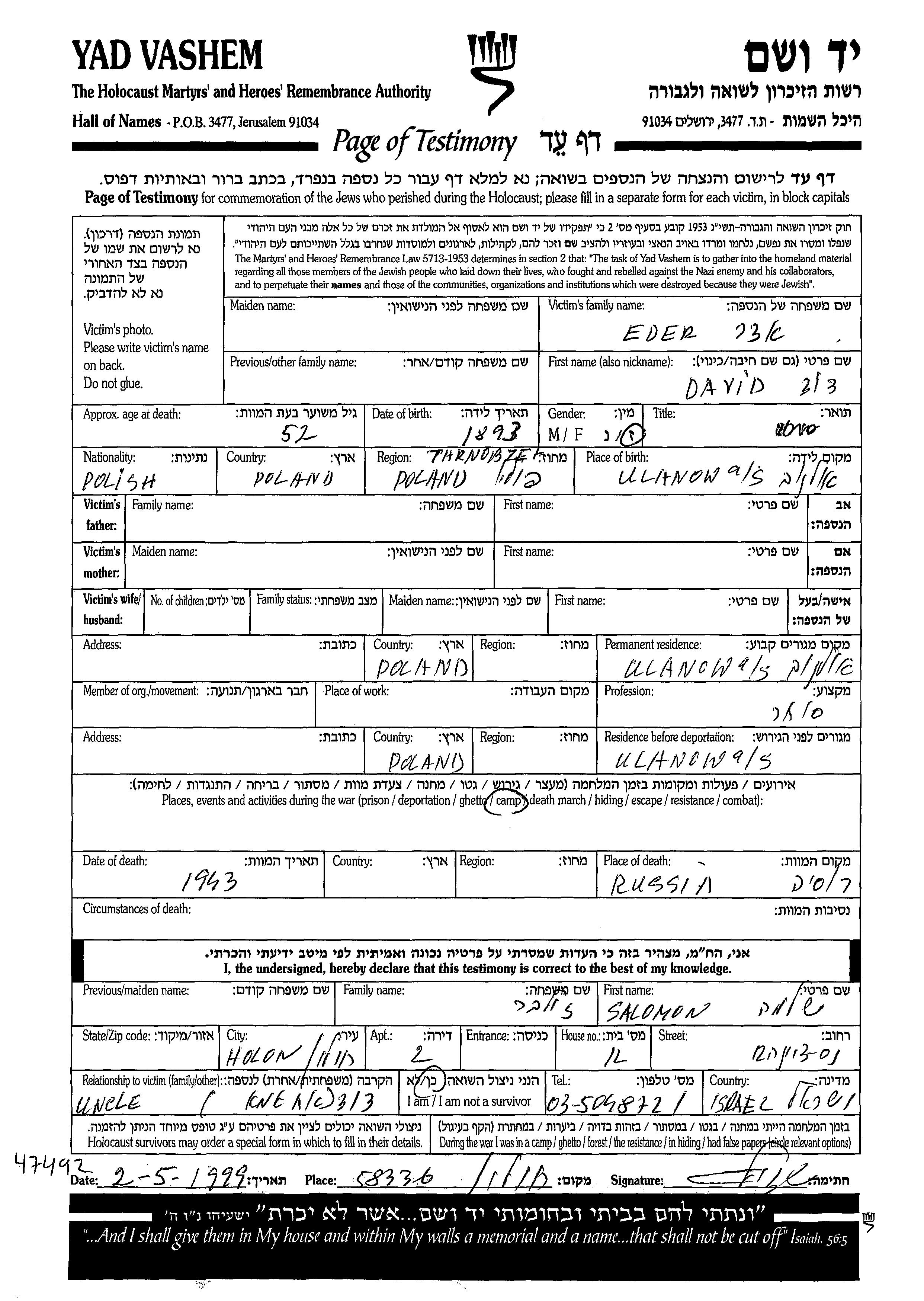 Eder David 1893 Ulanow, Pologne Feuille de témoignage