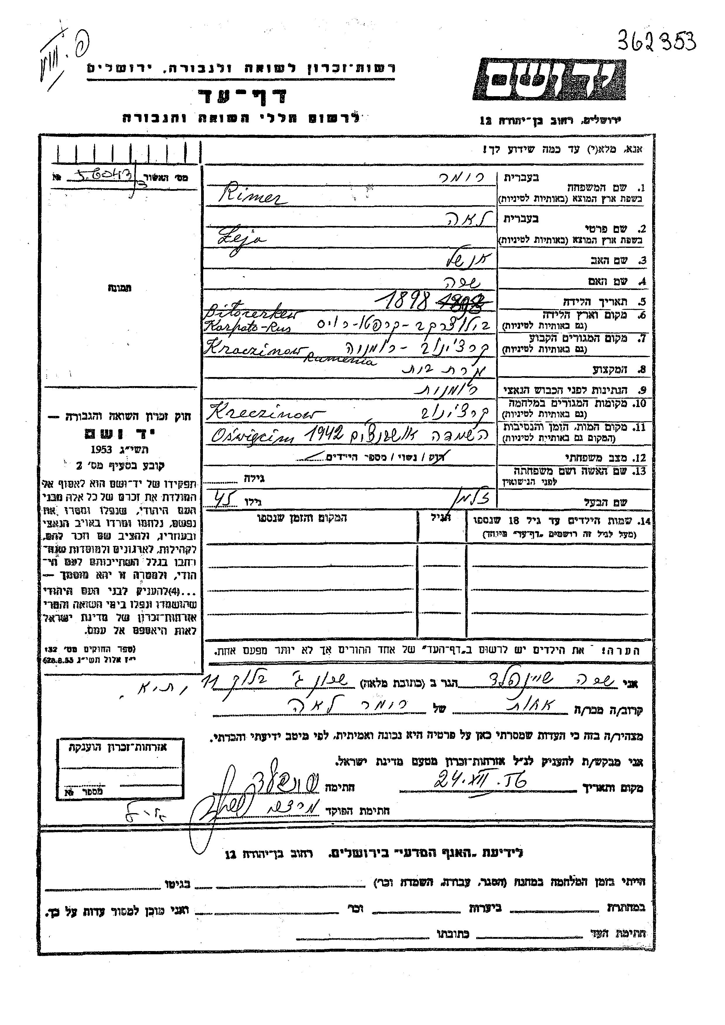 Rimer Leja 1898 Kraczinow, Roumanie Feuille de témoignage