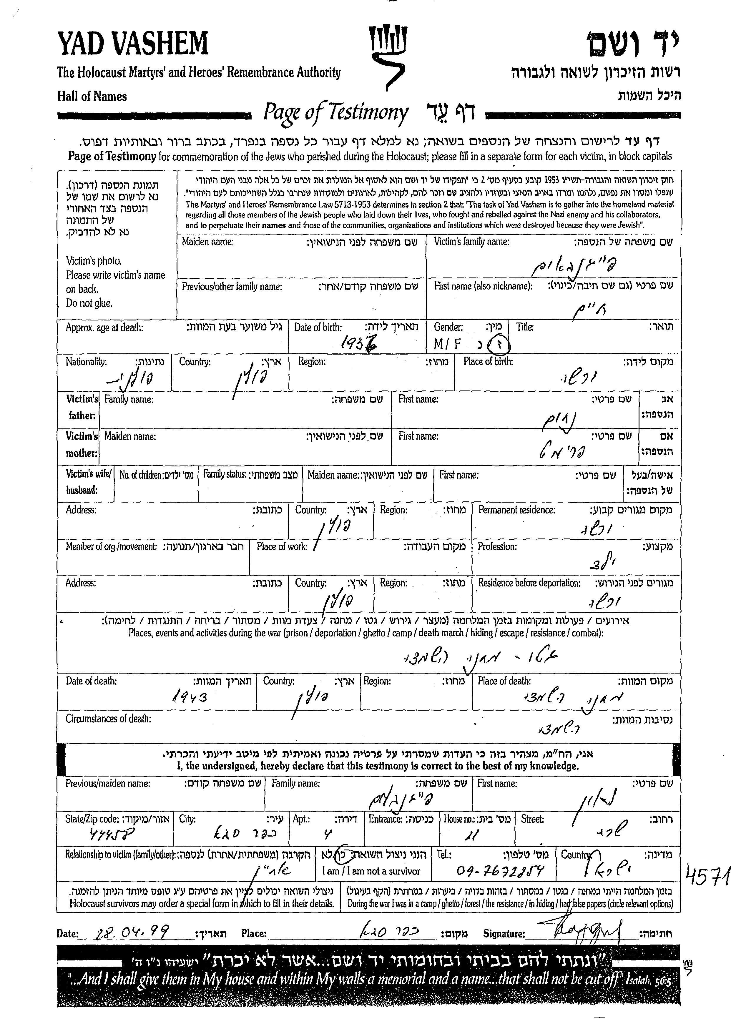 Yad Vashem - Pages of Testimony Names Memorial Collection
