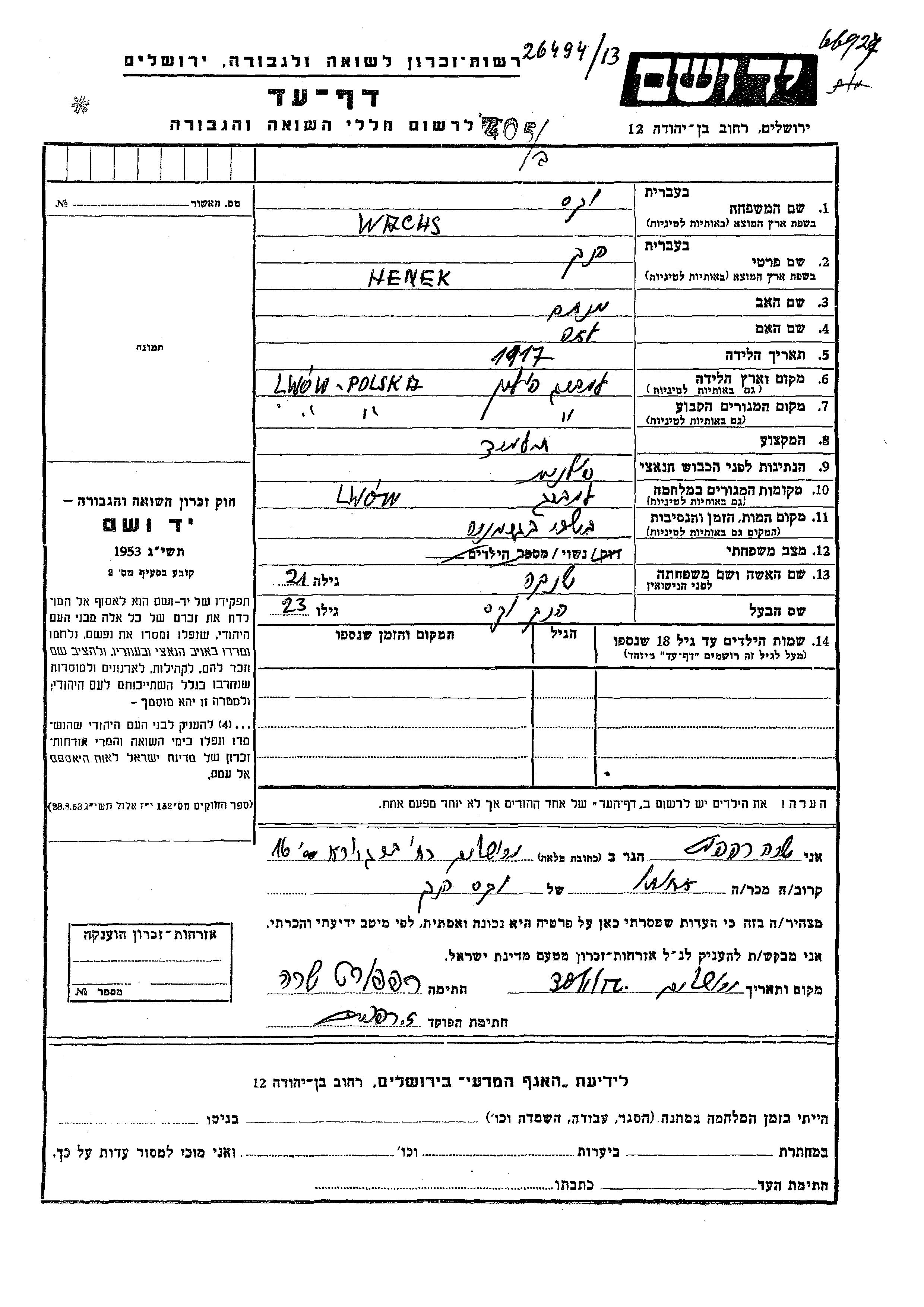 Wachs Henek 1917 Lwow, Pologne Feuille de témoignage