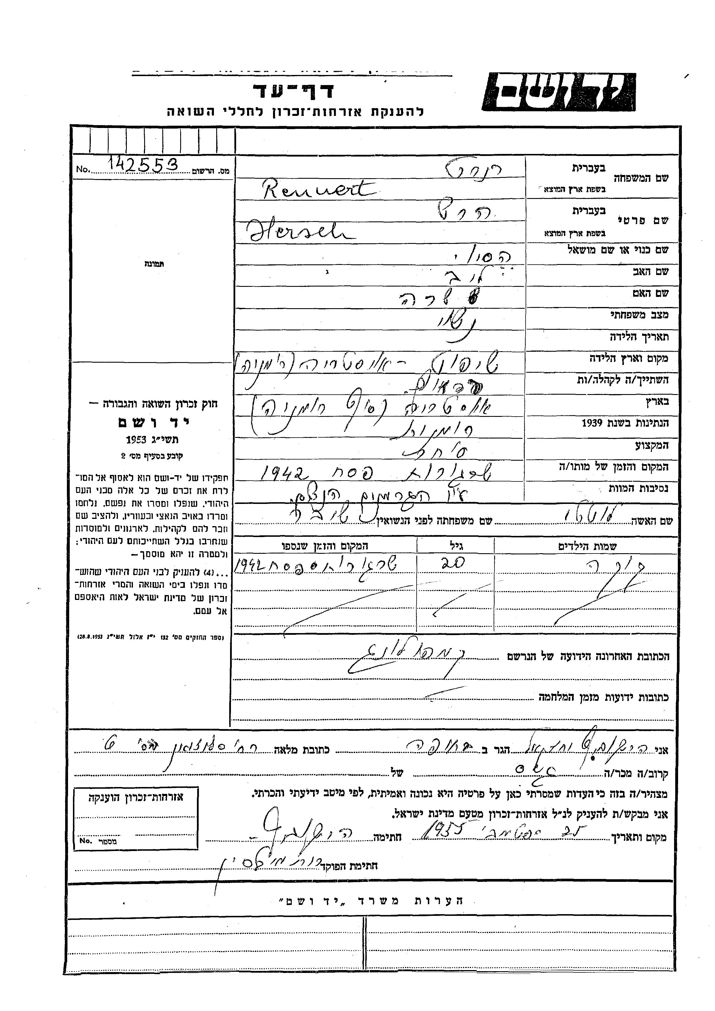 Rennert Hersch Hesio Radauti, Roumanie Feuille de témoignage