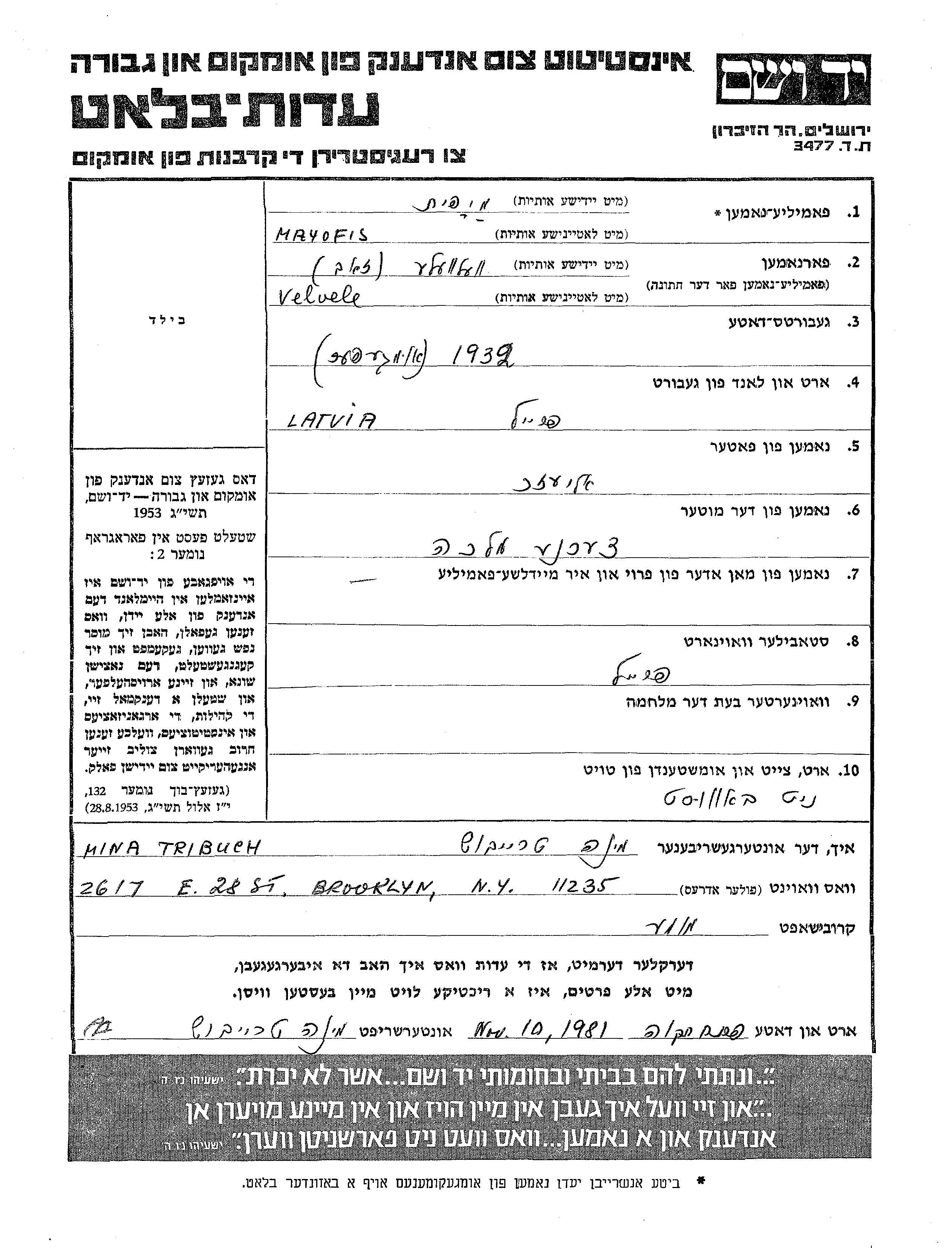 Mayofis Velvele Zeev 1932 Preili, Lettonie Feuille de témoignage