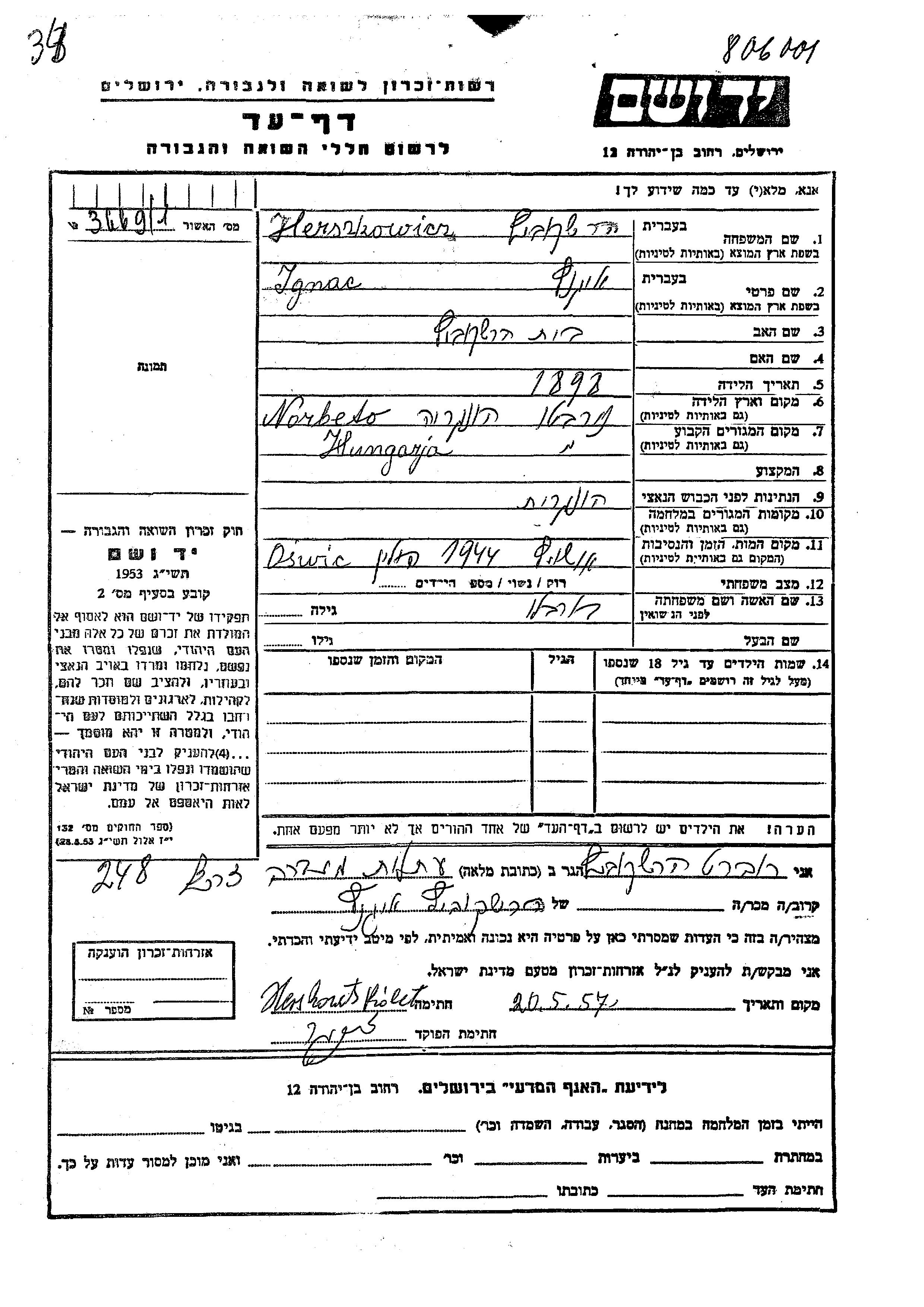 Herszkowicz Ignac 1898 Nyirbator, Hongrie Feuille de témoignage