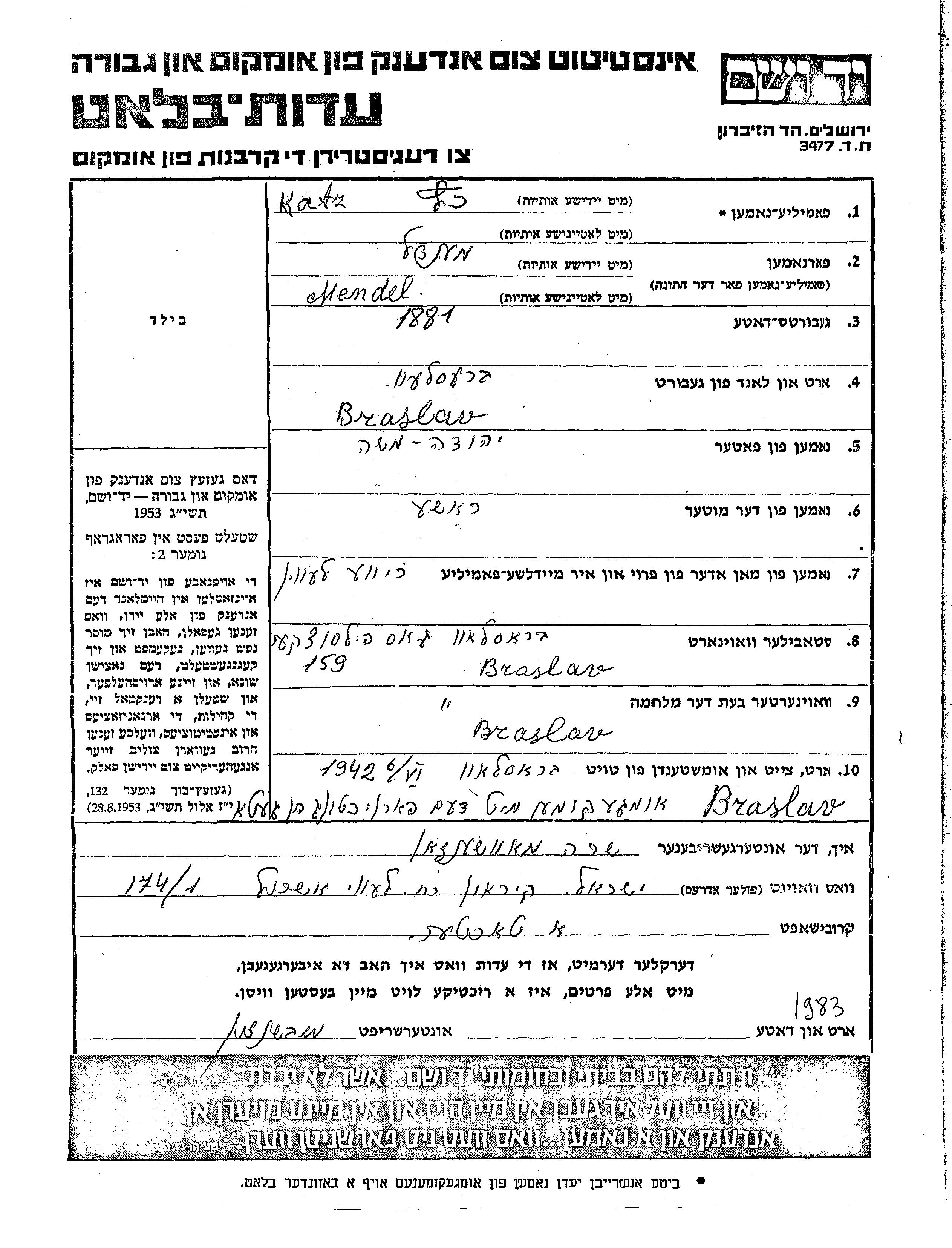 Katz Mendel 1881 Braslav, Pologne Feuille de témoignage
