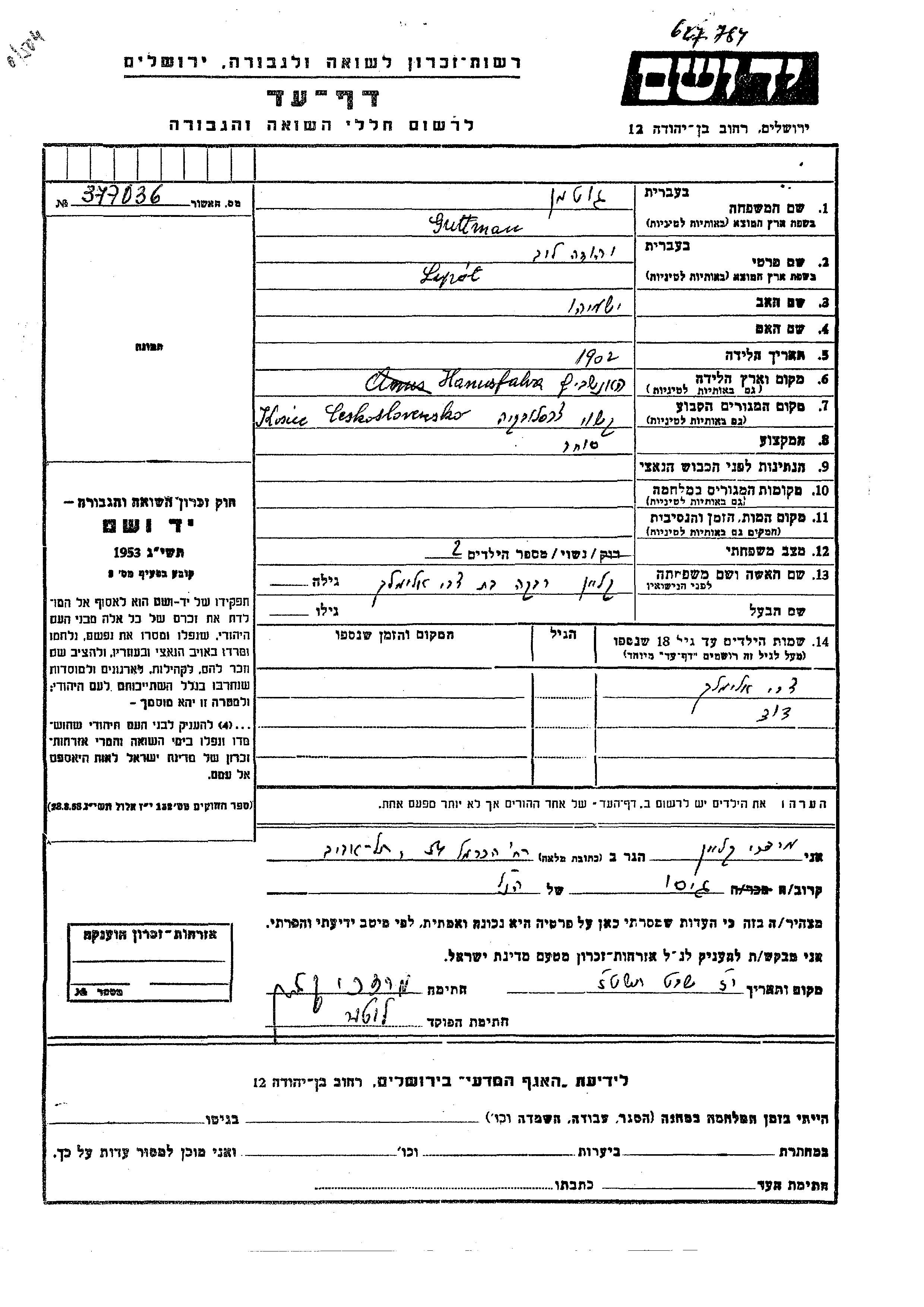 Guttman Yehuda Leib Lipot 1902 Kosice, Tchécoslovaquie Feuille de témoignage