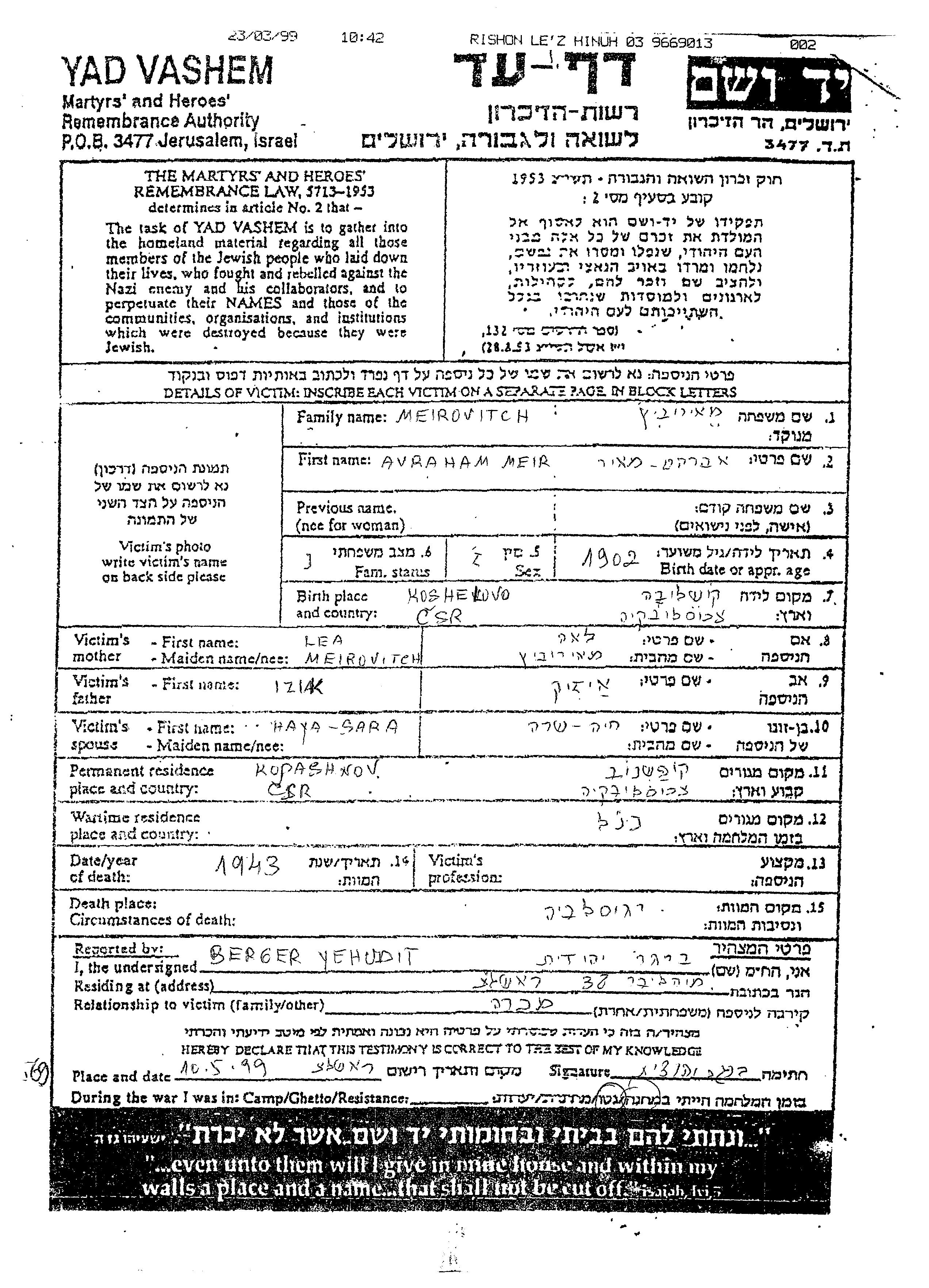 Meirovitch Avraham Meir 1902 Kopashnovo, Tchécoslovaquie Feuille de témoignage