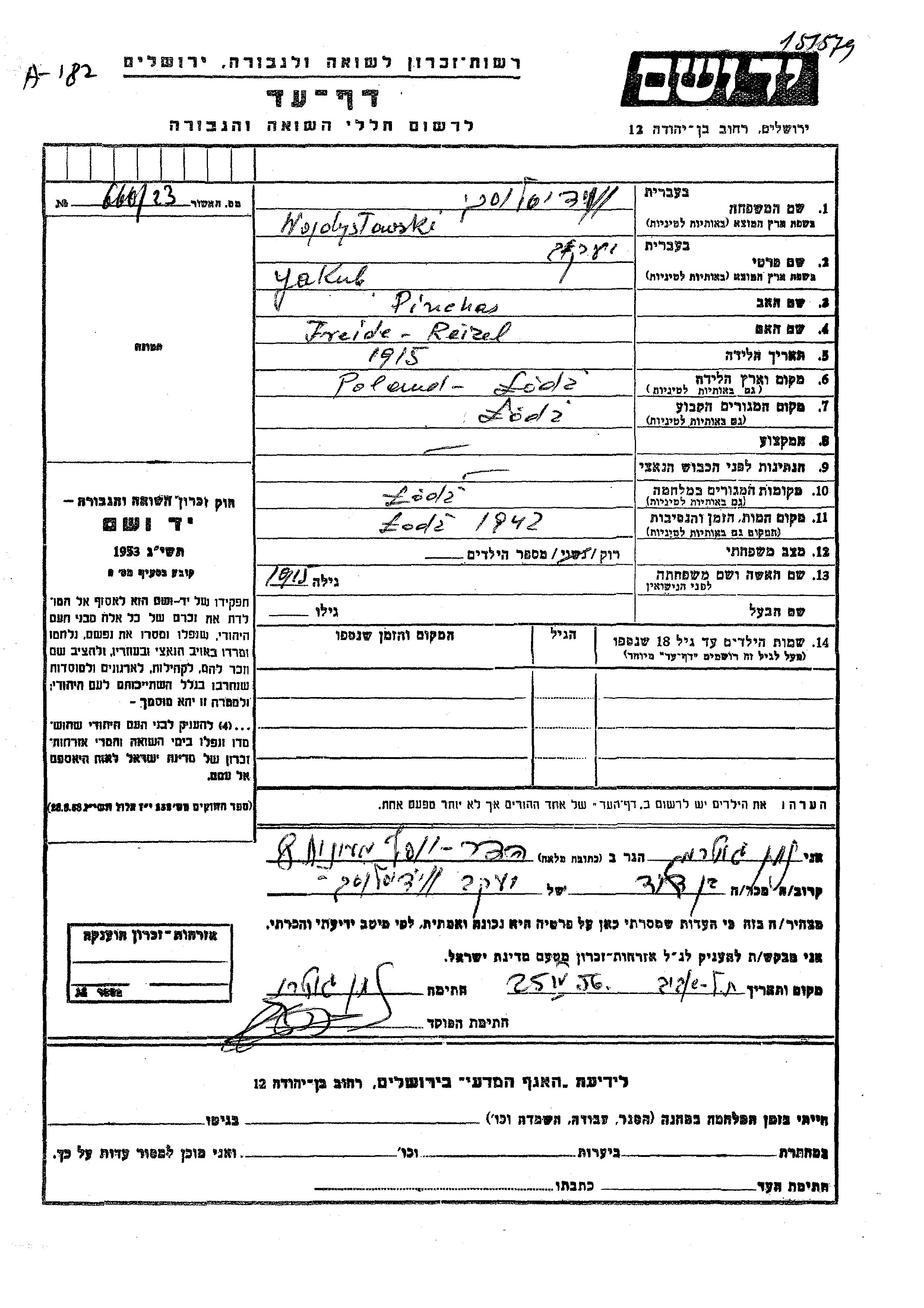Wojdyslawski Yakub 1915 Lodz, Pologne Feuille de témoignage