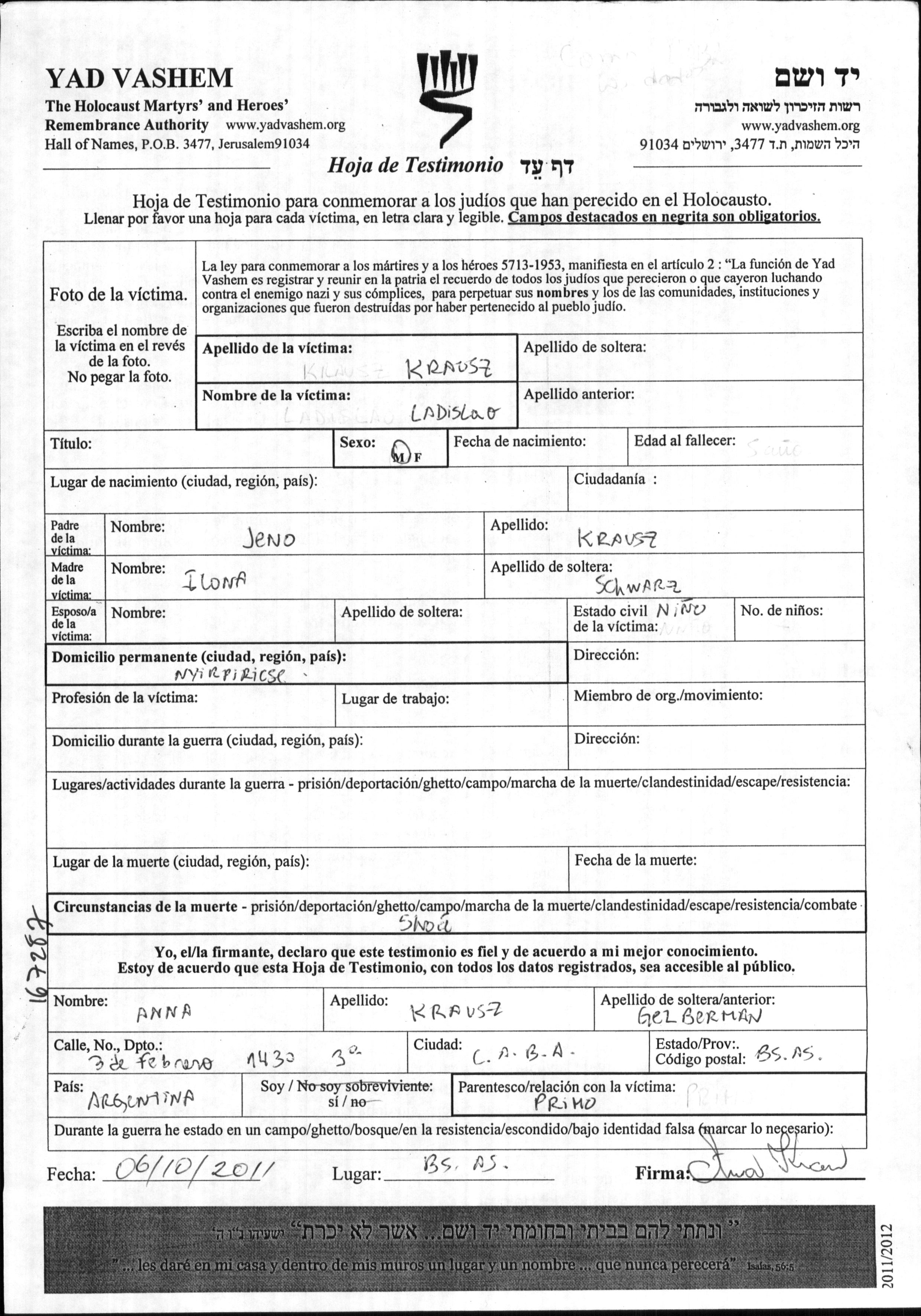Krausz Ladislao Nyirpiricse, Hongrie Feuille de témoignage