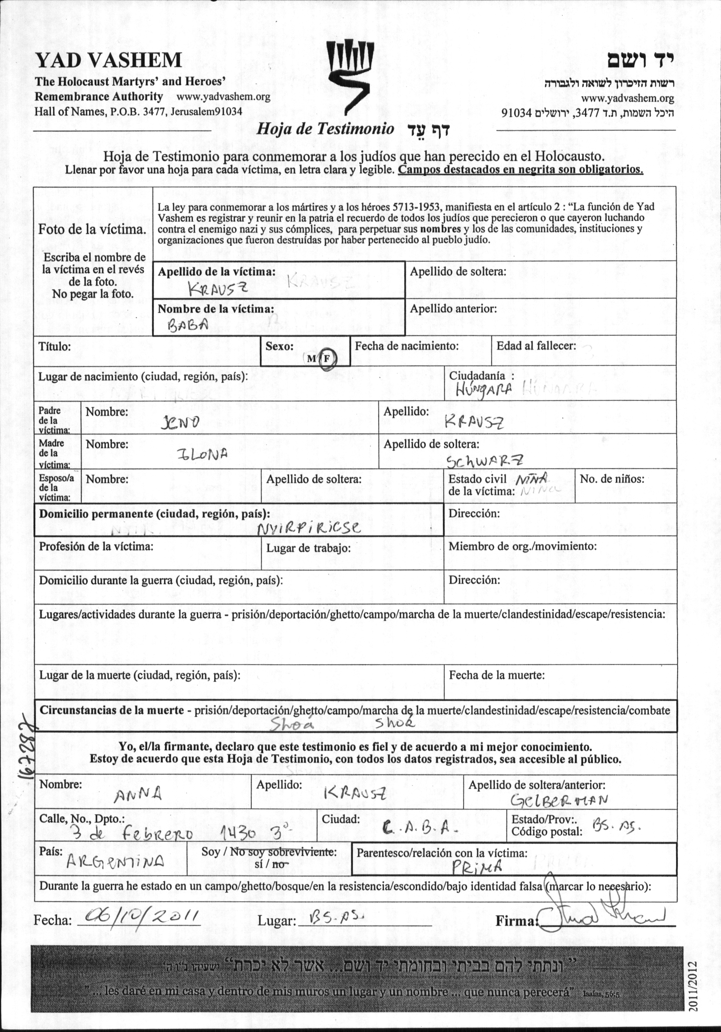 Krausz Baba Nyirpiricse, Hongrie Feuille de témoignage
