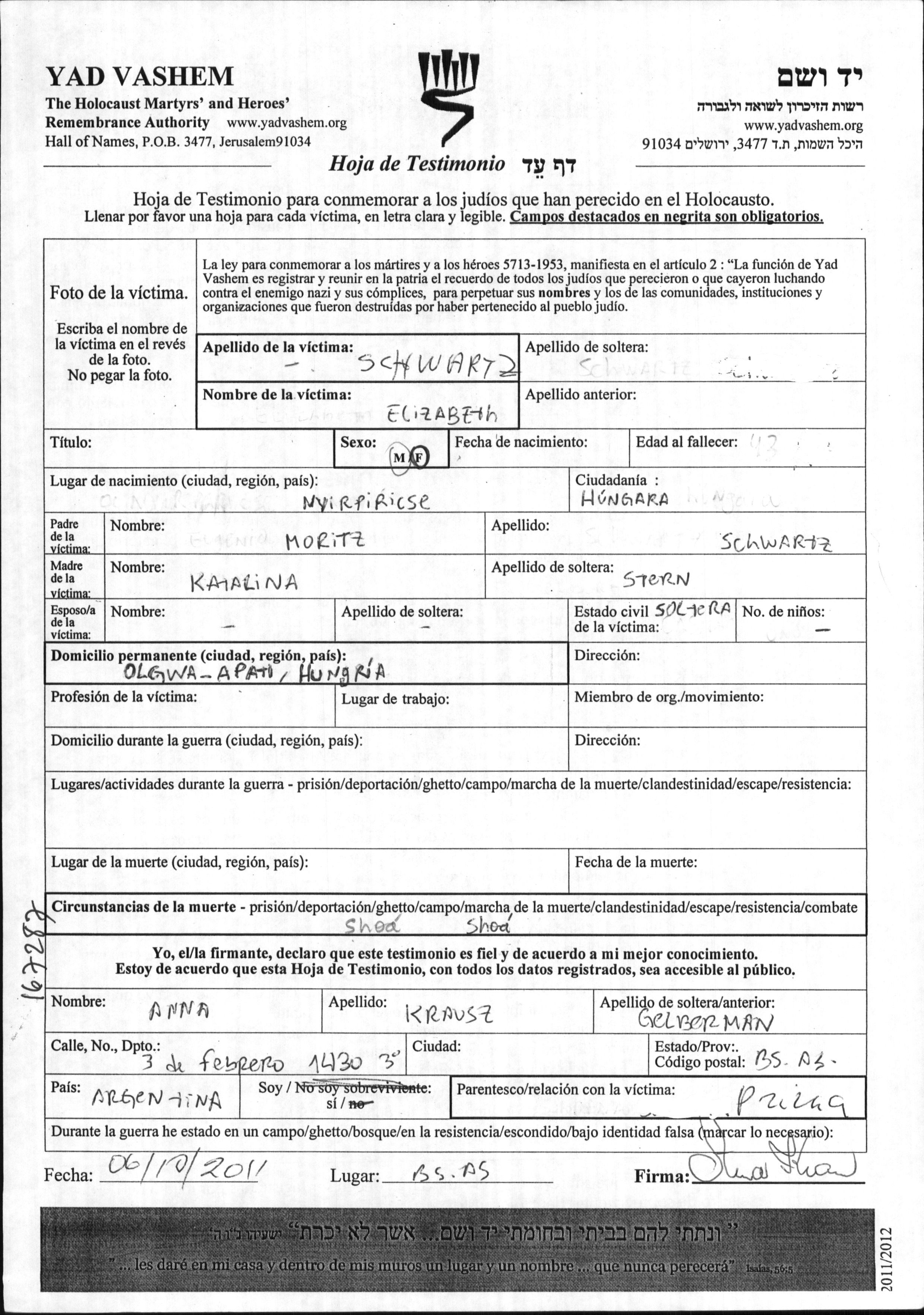 Schwartz Elizaberth Olaapati, Roumanie Feuille de témoignage
