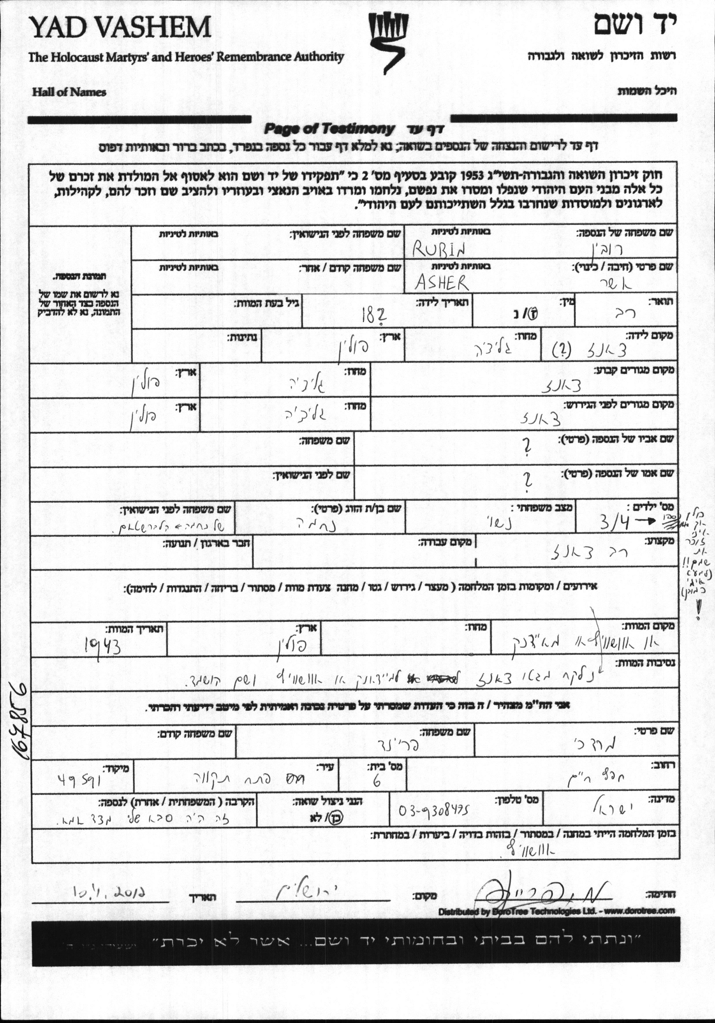 Rabbin Asher Rubin est né à Tzanz, Pologne. Il était Rabbin et Mariée à Nekhama née Halbershtein. Avant la seconde guerre mondiale il vivait à Tzanz, Pologne. Au cours de la guerre, il était à Ghetto.
