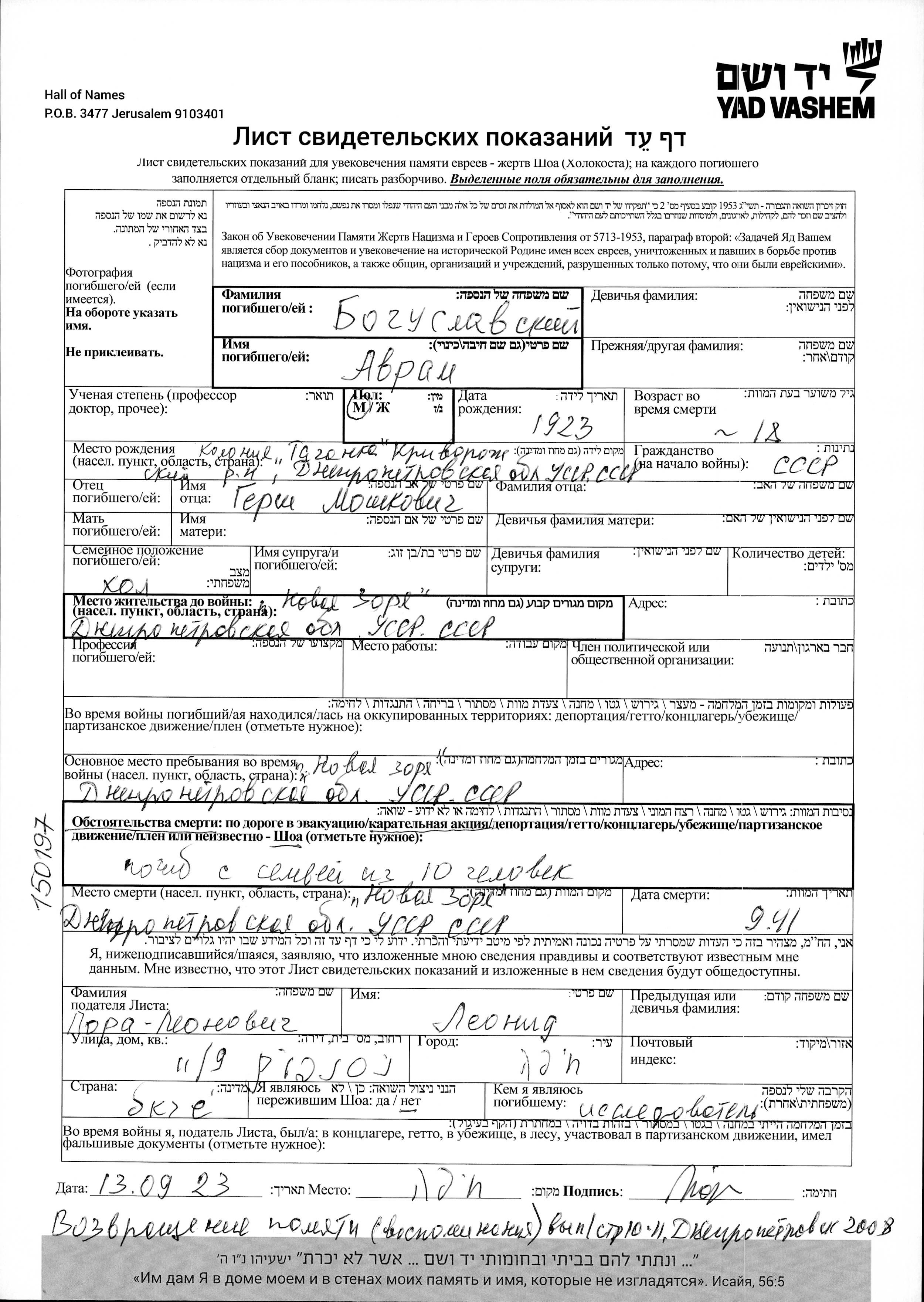 Boguslavskiy Avram 1923 Novaya Zorya, Ukraine (URSS) Feuille de témoignage