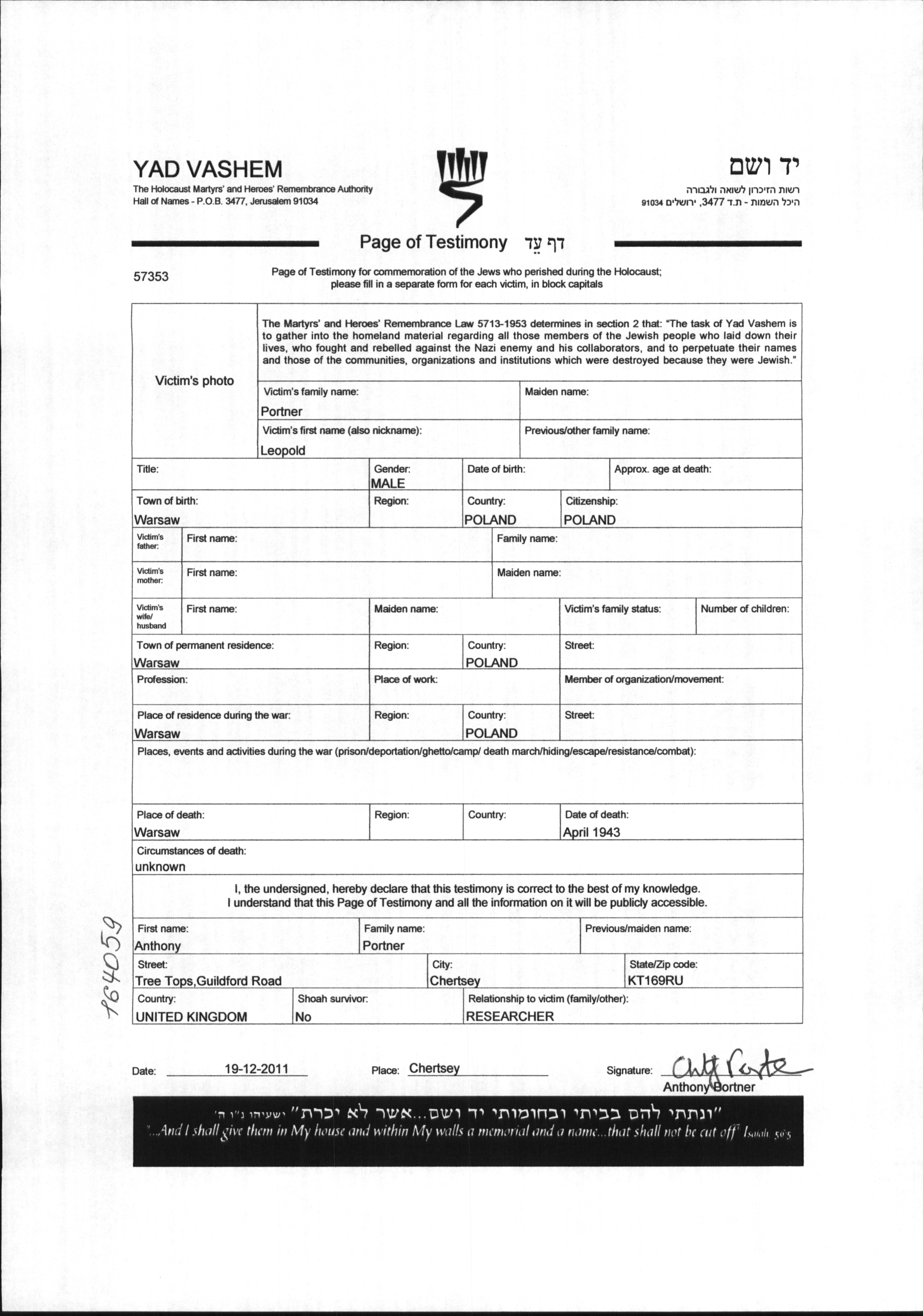 Leopold Portner est né à Warsaw, Pologne. Avant la seconde guerre mondiale il vivait à Warsaw, Pologne. Au cours de la guerre, il était à Warsaw, Pologne.