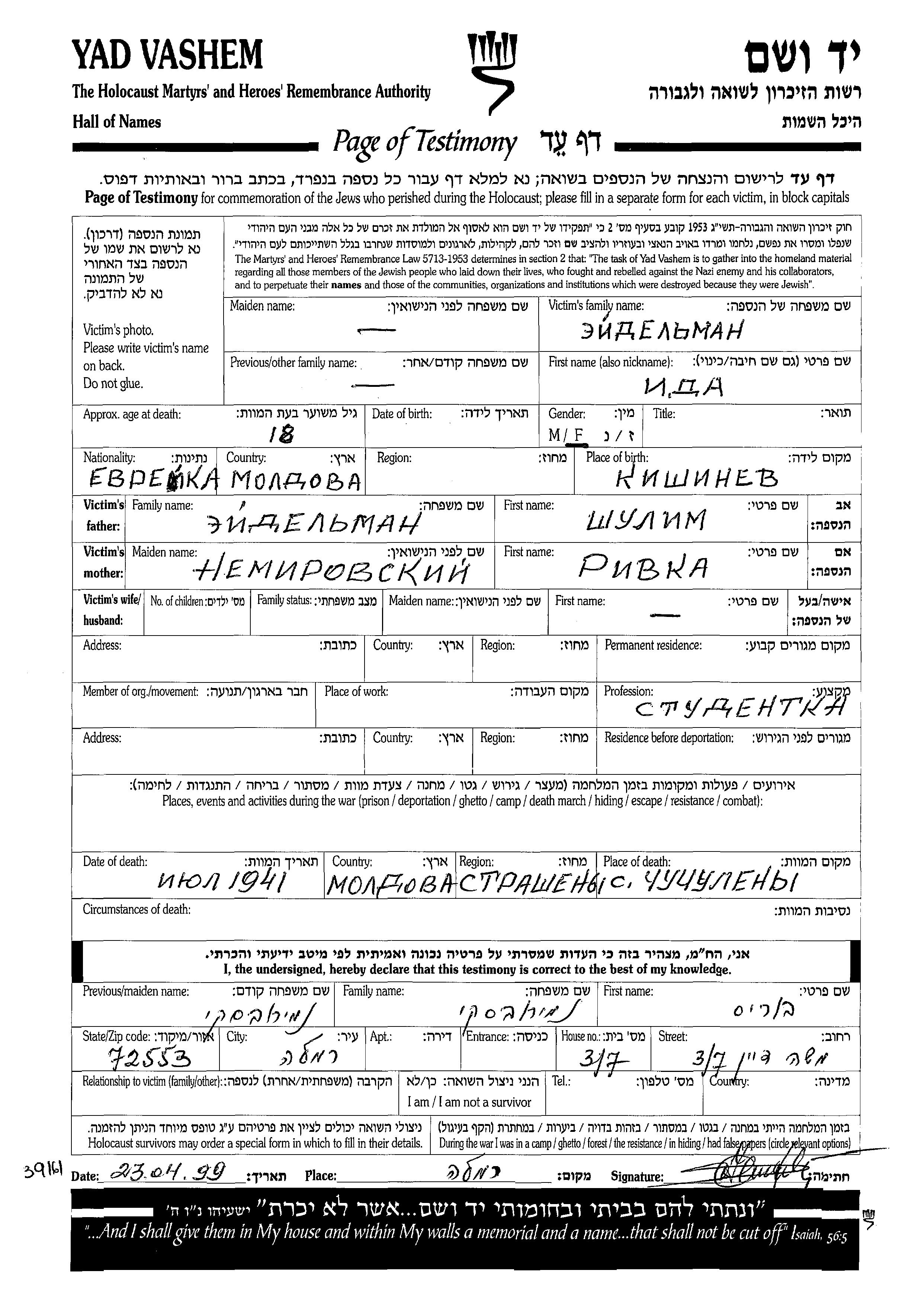 Yad Vashem - Pages of Testimony Names Memorial Collection