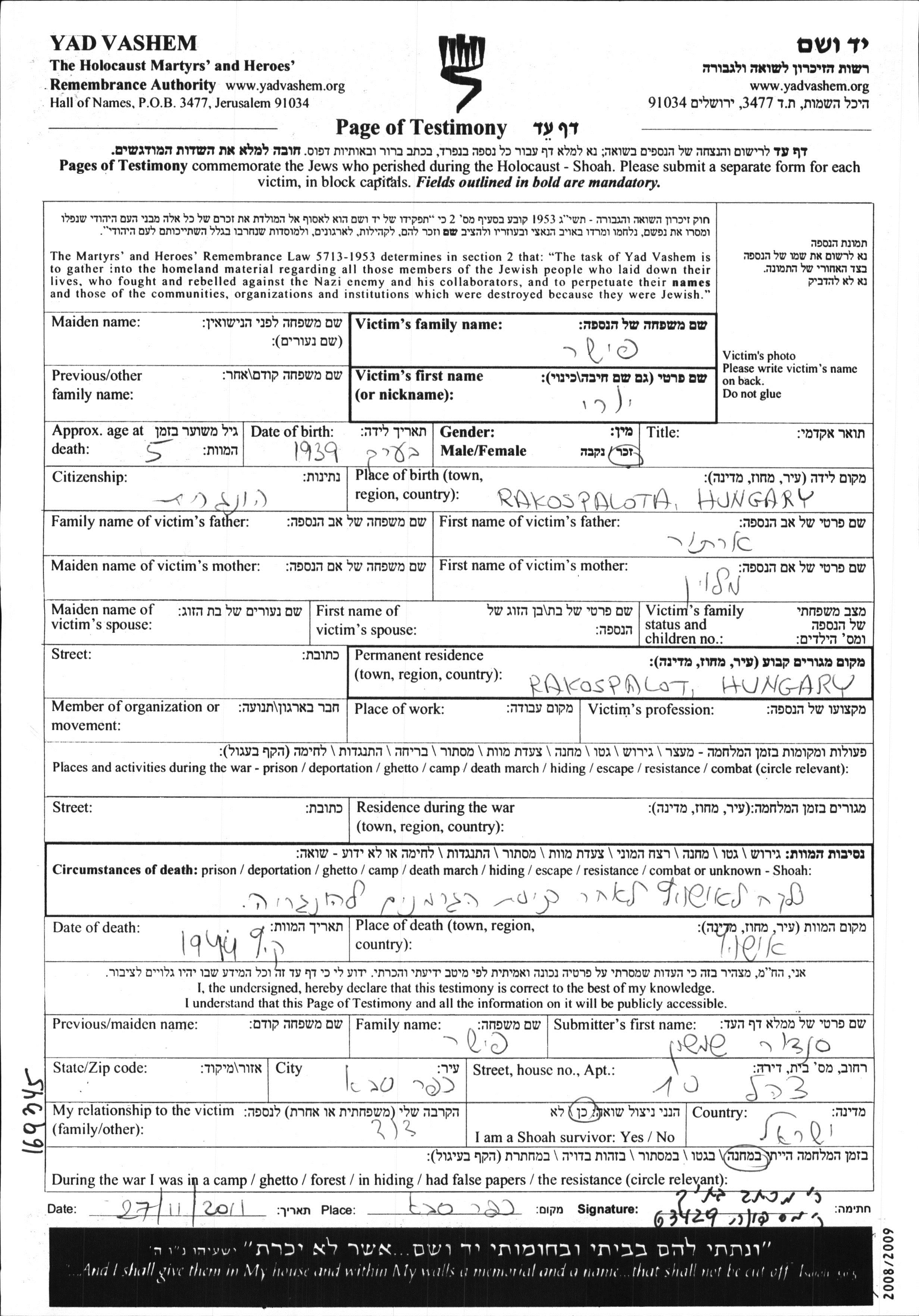 Yad Vashem - Pages of Testimony Names Memorial Collection