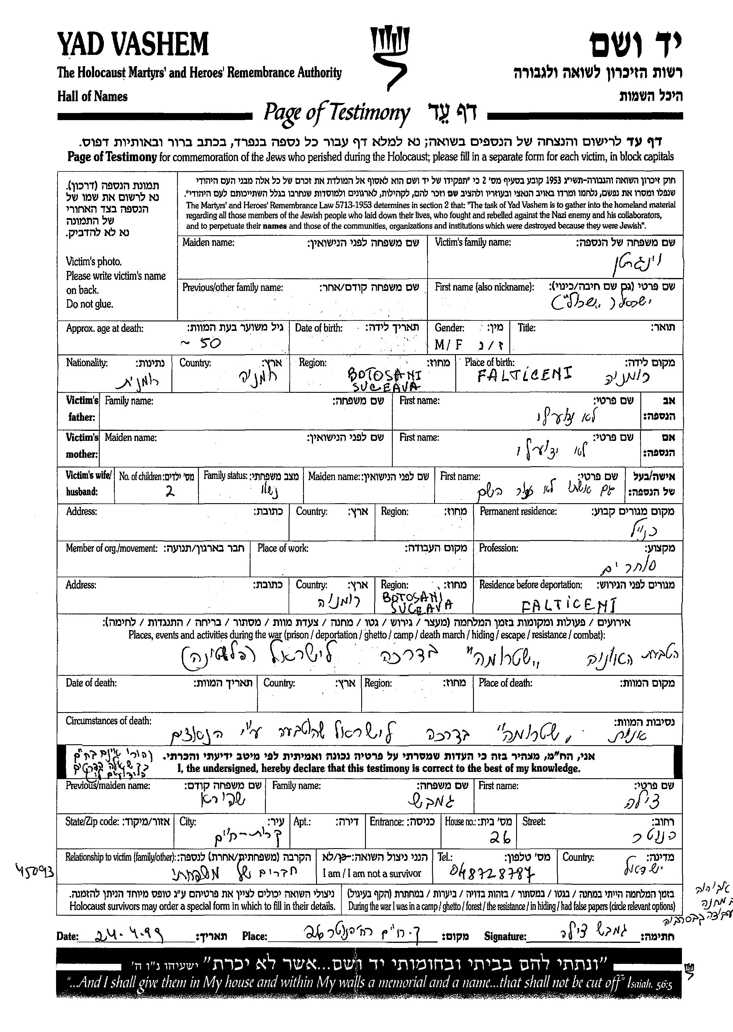 Vaingarten Yisrael Falticeni, Roumanie Feuille de témoignage