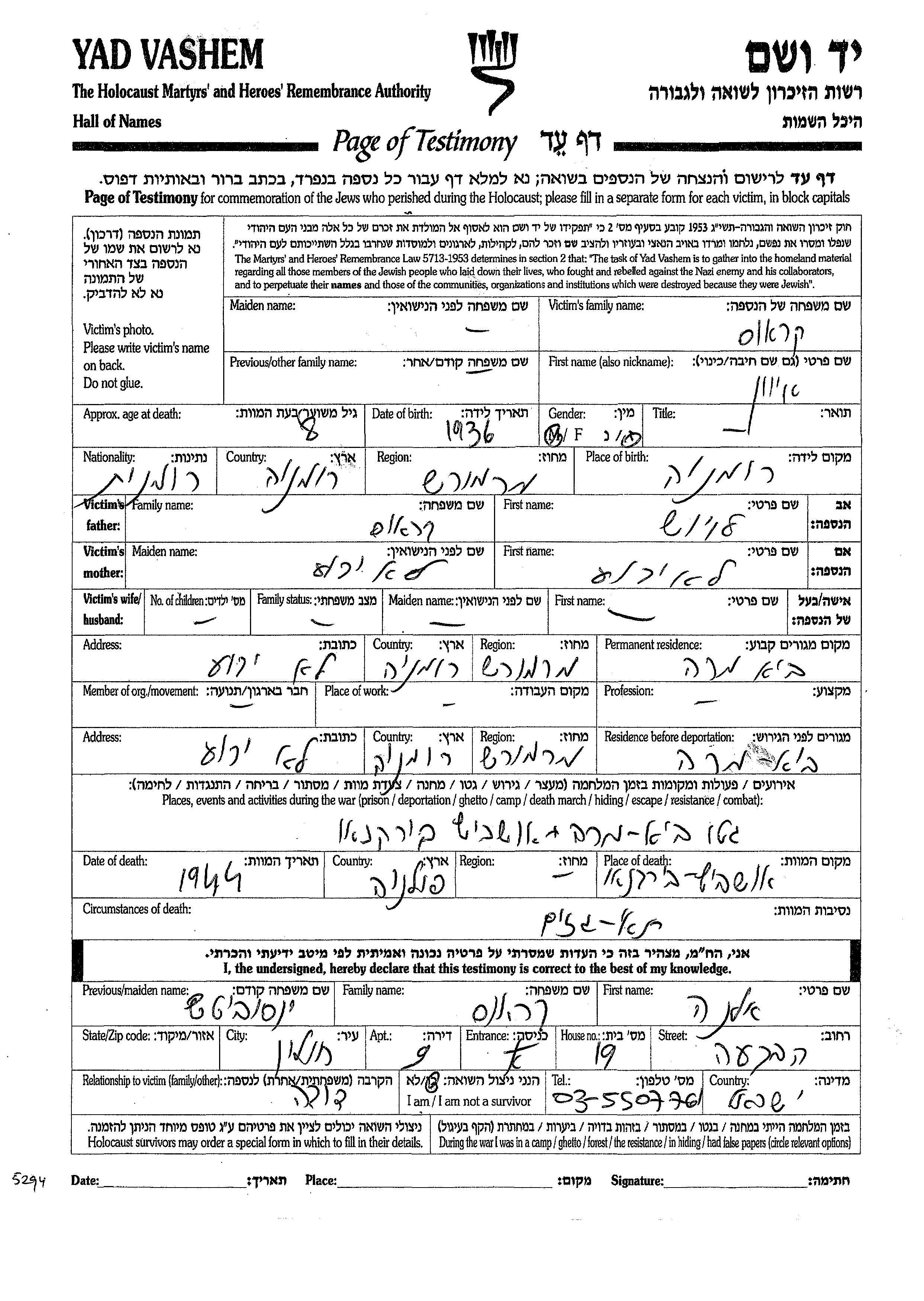 Yad Vashem - Pages of Testimony Names Memorial Collection