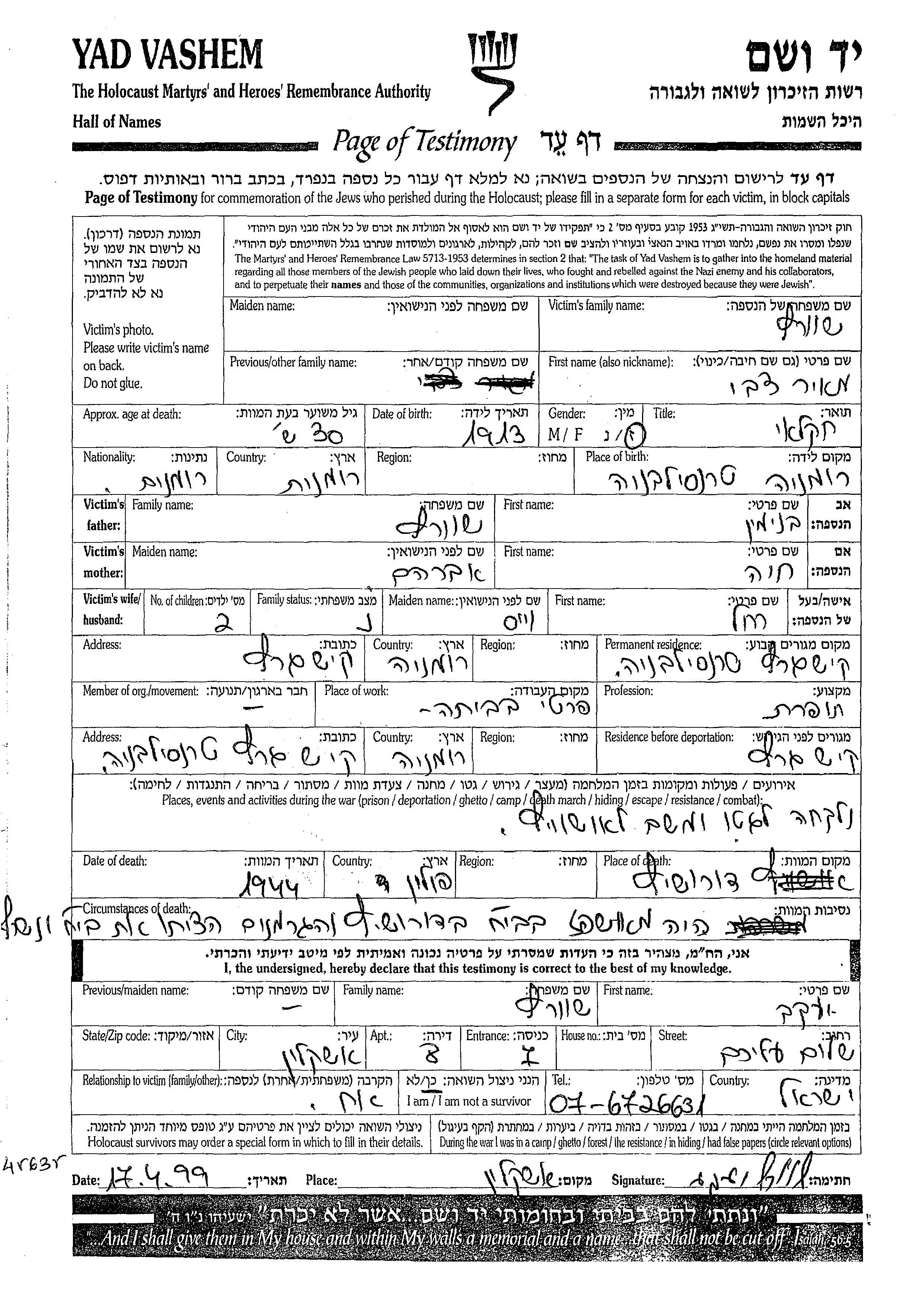 Yad Vashem - Pages of Testimony Names Memorial Collection