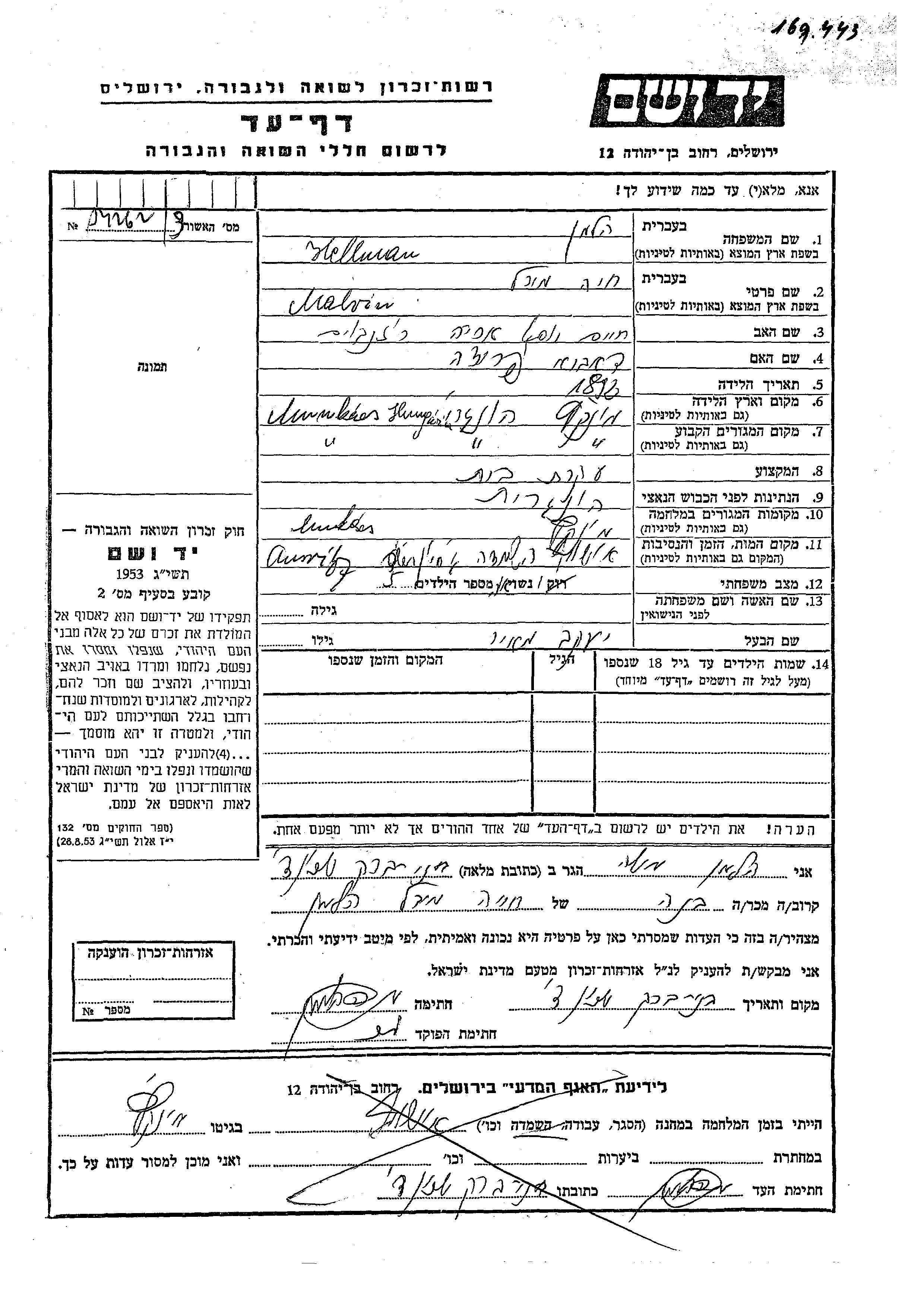 Hellman Khaia Mirl Malvin 1892 Munkacs, Tchécoslovaquie Feuille de témoignage